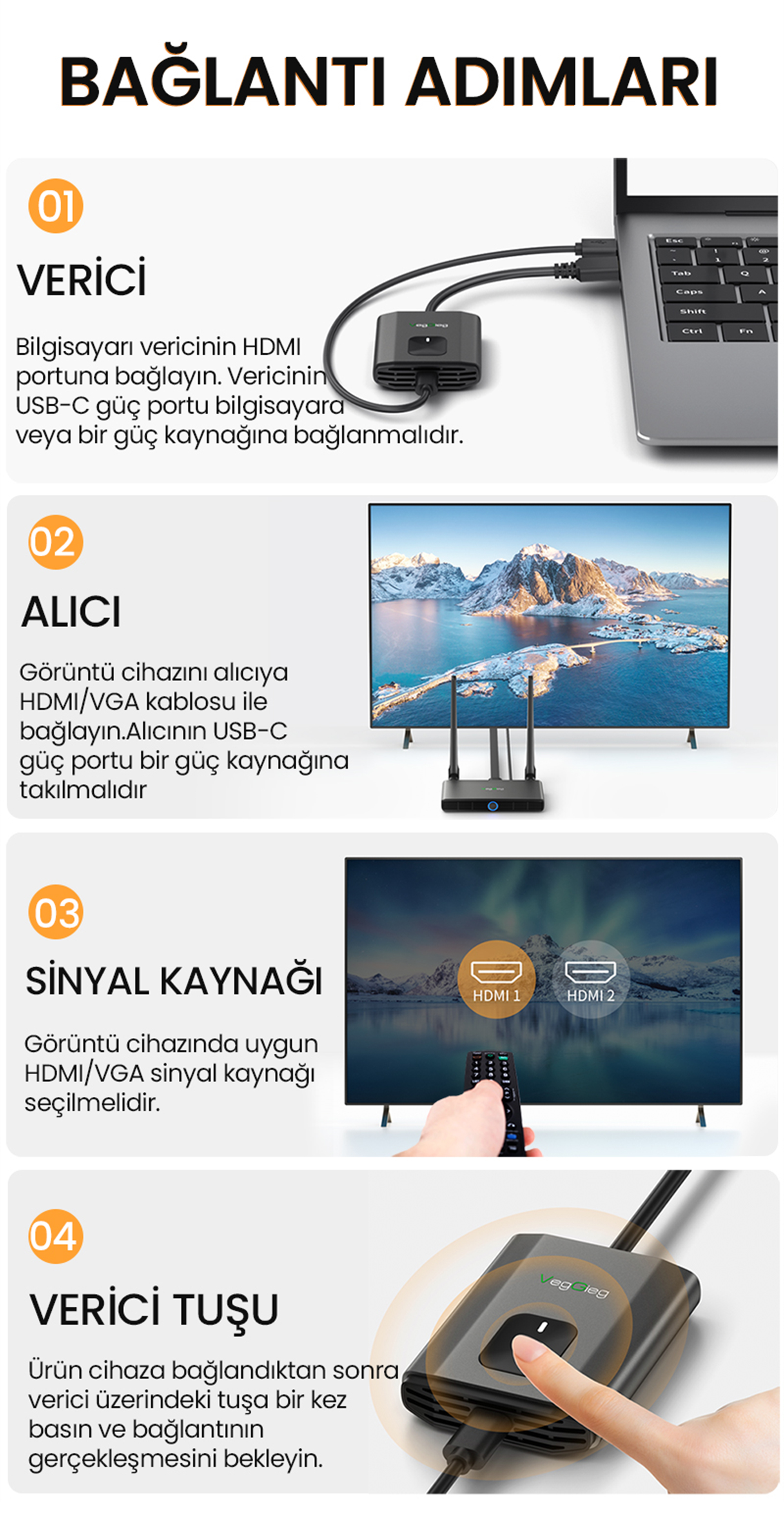 50 metreye kadar kablosuz menzil sunan VegGieg 5GHz görüntü aktarım cihazı, geniş ofislerde, sınıflarda veya salonlarda kullanım için idealdir. Sinyal gücü, ortam koşullarına bağlı olarak kararlı performans sergiler.