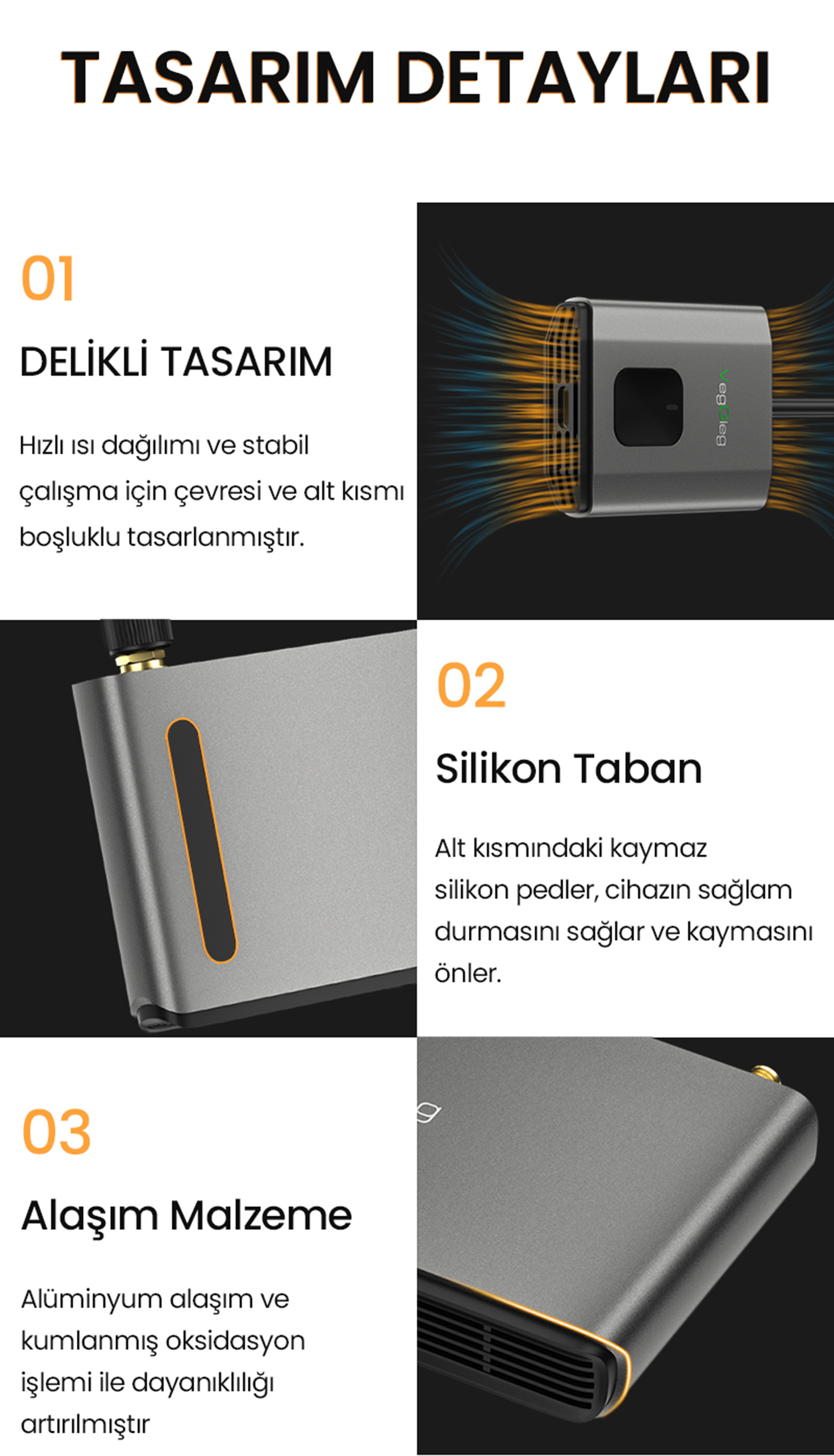 ABS ve alüminyum malzeme kullanılarak üretilen cihaz, ısıya ve darbelere karşı dayanıklıdır. Şık koyu gri tasarımıyla profesyonel ortamlara uyum sağlar. USB-C güç girişi sayesinde pratik ve modern bir enerji bağlantısı sunar.