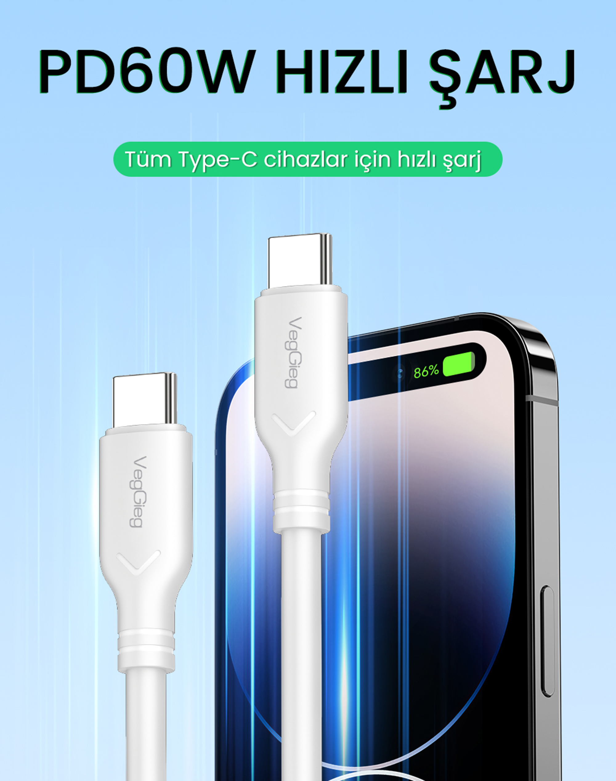 Modern teknolojiye sahip cihazlar için tasarlanan VegGieg Type-C to Type-C hızlı şarj ve veri kablosu, güçlü, güvenli ve dayanıklı yapısıyla tüm Type-C kullanıcılarına yüksek performans sunar. 1.2 metrelik ideal uzunluk, PD 3.0 destekli 60W hızlı şarj ve 480 Mbps veri aktarım hızı ile günlük kullanımda maksimum verimlilik sağlar. Hem şarj hem de veri aktarımında yüksek performans arayan kullanıcılar için ideal bir çözümdür.