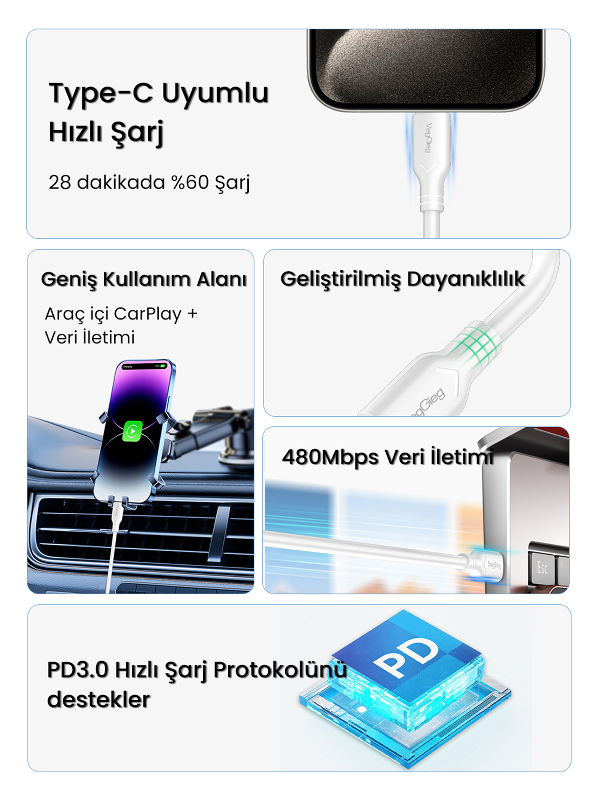 VegGieg hızlı şarj kablosu, Power Delivery 3.0 (PD 3.0) teknolojisi sayesinde uyumlu cihazları yalnızca 28 dakikada %60’a kadar şarj edebilir. Bu özellik, hem günlük kullanımda hem de acil durumlarda önemli ölçüde zaman kazandırır. iPhone 15 – iPhone 16 serileri, Samsung, Huawei, Xiaomi ve daha birçok Type-C cihazla tam uyumludur.