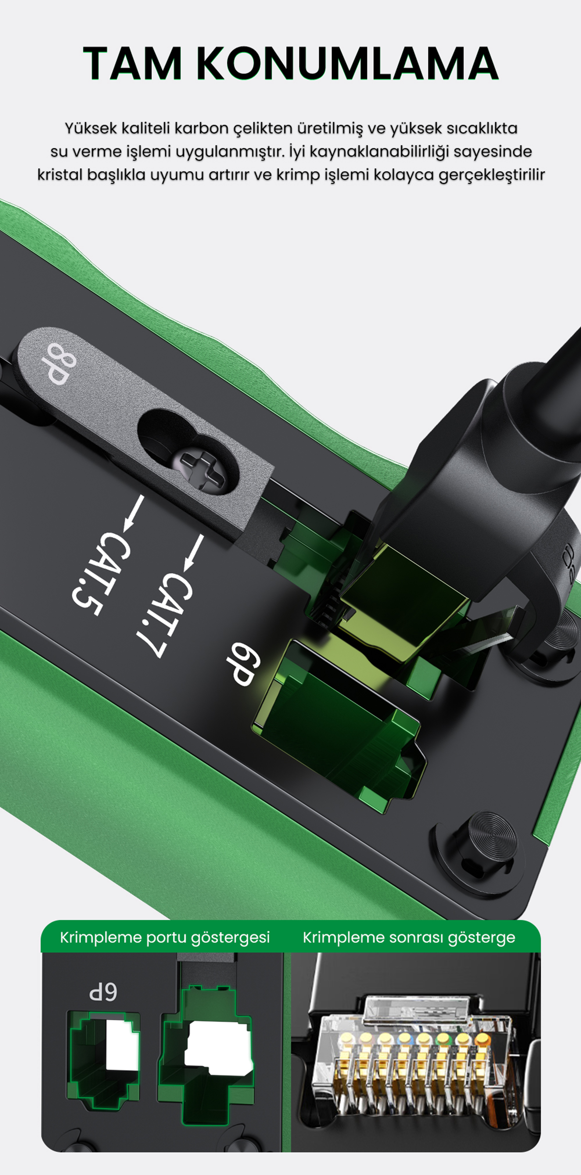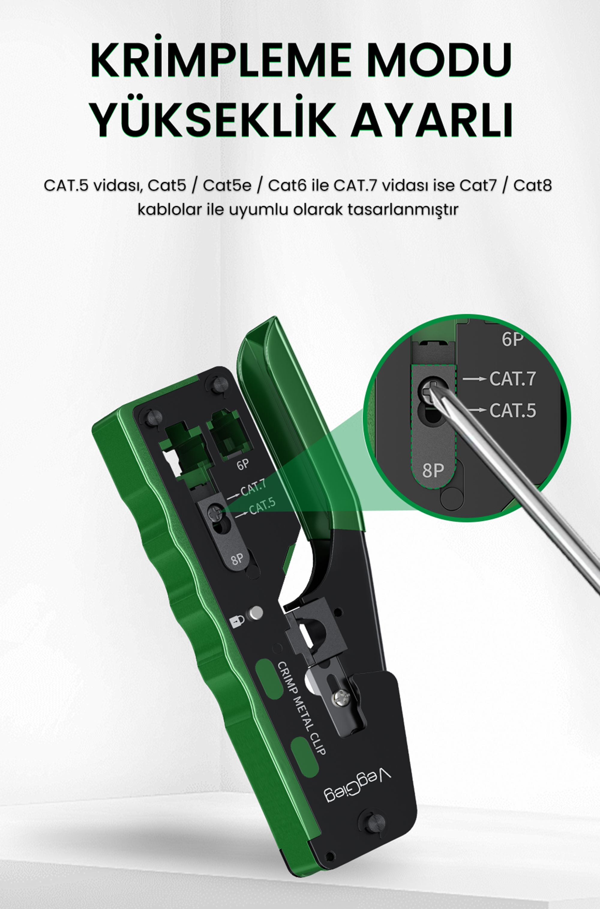 6P ve 8P universal sıkma desteği sunan VegGieg, RJ45 konnektörlerin kabloya doğru basınçla ve düzgün şekilde sabitlenmesine yardımcı olur. Pass-through (geçmeli) RJ45 konnektörler ile uyumlu yapısı, kablo uçlarının konnektör içinde doğru hizalanmasını kolaylaştırır. Bu sayede hatalı sıkıştırma riskini azaltır ve her kullanımda daha tutarlı, sağlam ve uzun ömürlü bağlantılar elde edilmesine katkı sağlar. Ağ performansını olumsuz etkileyebilecek temas sorunlarının önüne geçmeyi hedefler.