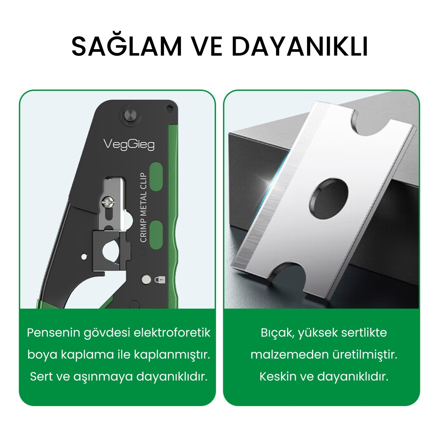 VegGieg, sıkma, kesme, kablo soyma ve çakma işlemlerini tek gövdede sunan 4 in 1 network kablo pensesi tasarımına sahiptir. Bu çok fonksiyonlu yapı, ağ kablolama sürecinde iş akışını hızlandırır ve farklı aletler arasında geçiş ihtiyacını ortadan kaldırır. Özellikle yoğun kablolama işlemlerinde zamandan tasarruf sağlarken, daha düzenli ve kontrollü bir çalışma ortamı oluşturulmasına katkıda bulunur.