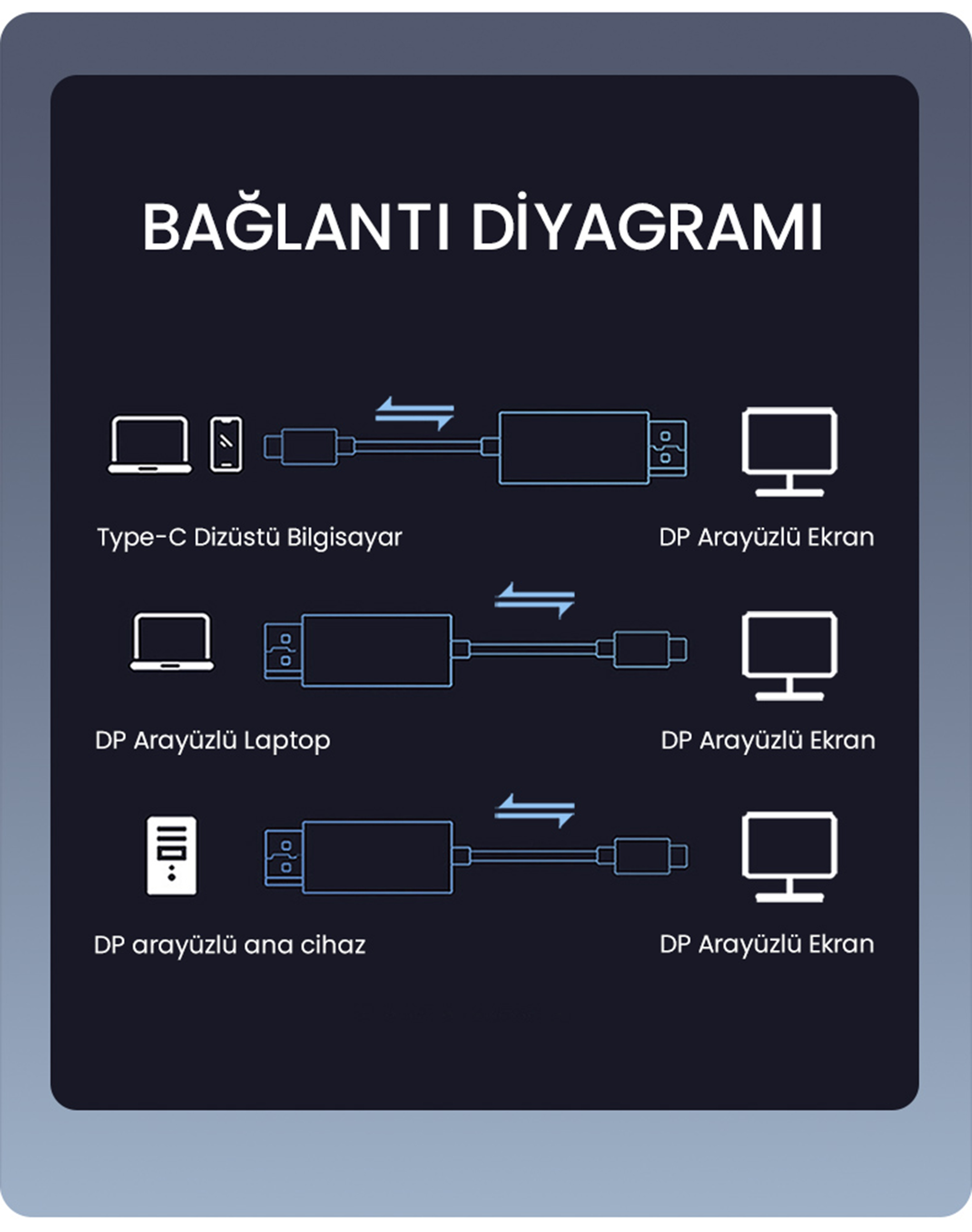 Çift Yönlü Type-C - DP Bağlantı DesteğiKablonun çift yönlü çalışması, onu diğer klasik görüntü kablolarından ayırır. İster Type-C çıkışından DP girişine, ister DP çıkışından Type-C girişine görüntü aktarımı gerçekleştirebilirsiniz. Bu esneklik, farklı cihaz kombinasyonlarında tek kabloyla sorunsuz kullanım imkanı sunar.