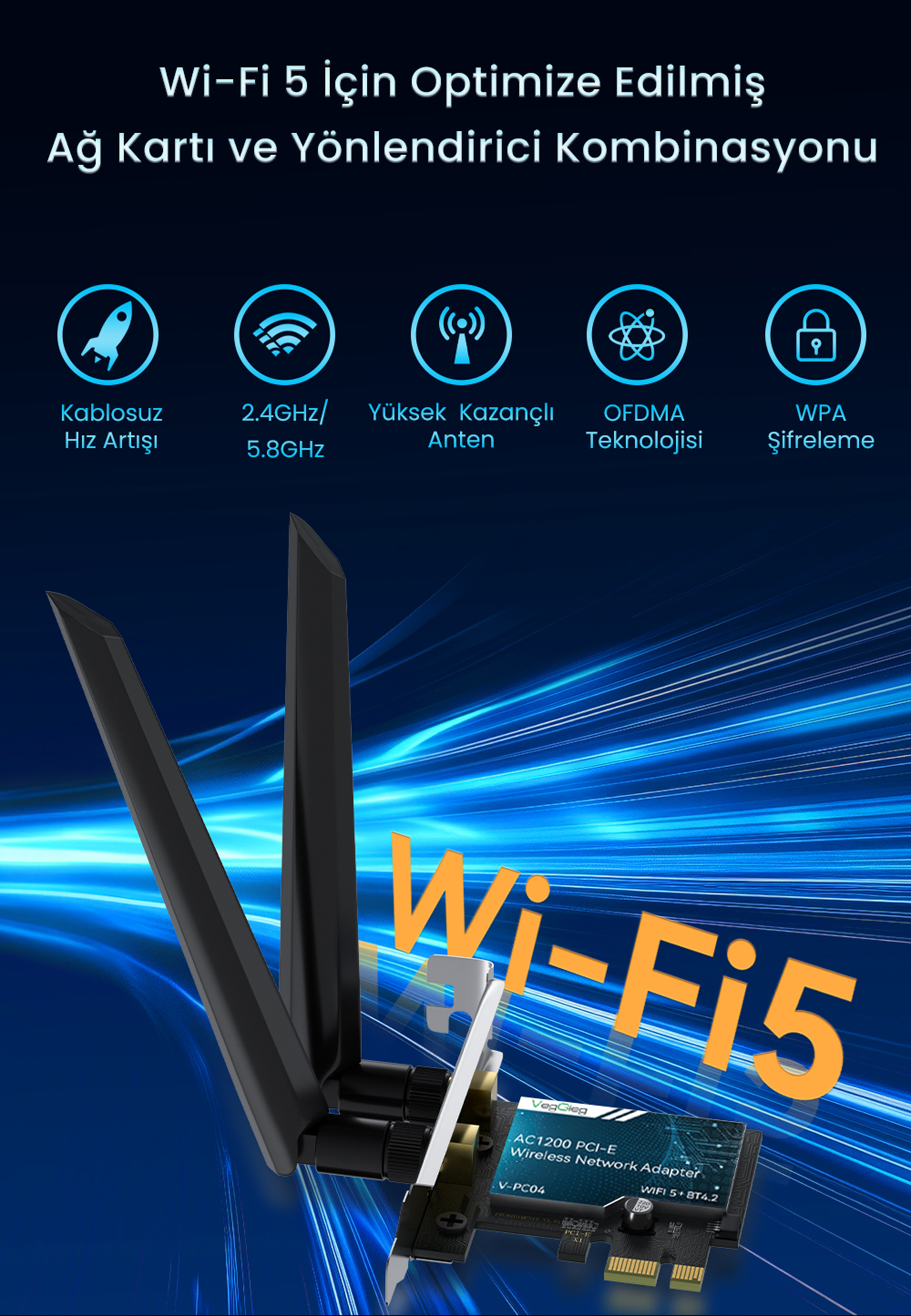 VegGieg AX1200 PCI-E Wireless Network Adapter, masaüstü bilgisayarlarda kablosuz ağ ve Bluetooth bağlantı ihtiyaçlarını karşılamak için tasarlanmıştır. WiFi 5 ve Bluetooth 4.2 desteği sunan bu adaptör, 1200 Mbps’ye kadar veri iletim hızı ile yüksek hızlı kablosuz bağlantı hedefler. PCI-E arayüzü üzerinden çalışan yapısı sayesinde sistemle stabil bir bağlantı sağlar ve çift bant desteği ile daha esnek kullanım imkânı sunar.