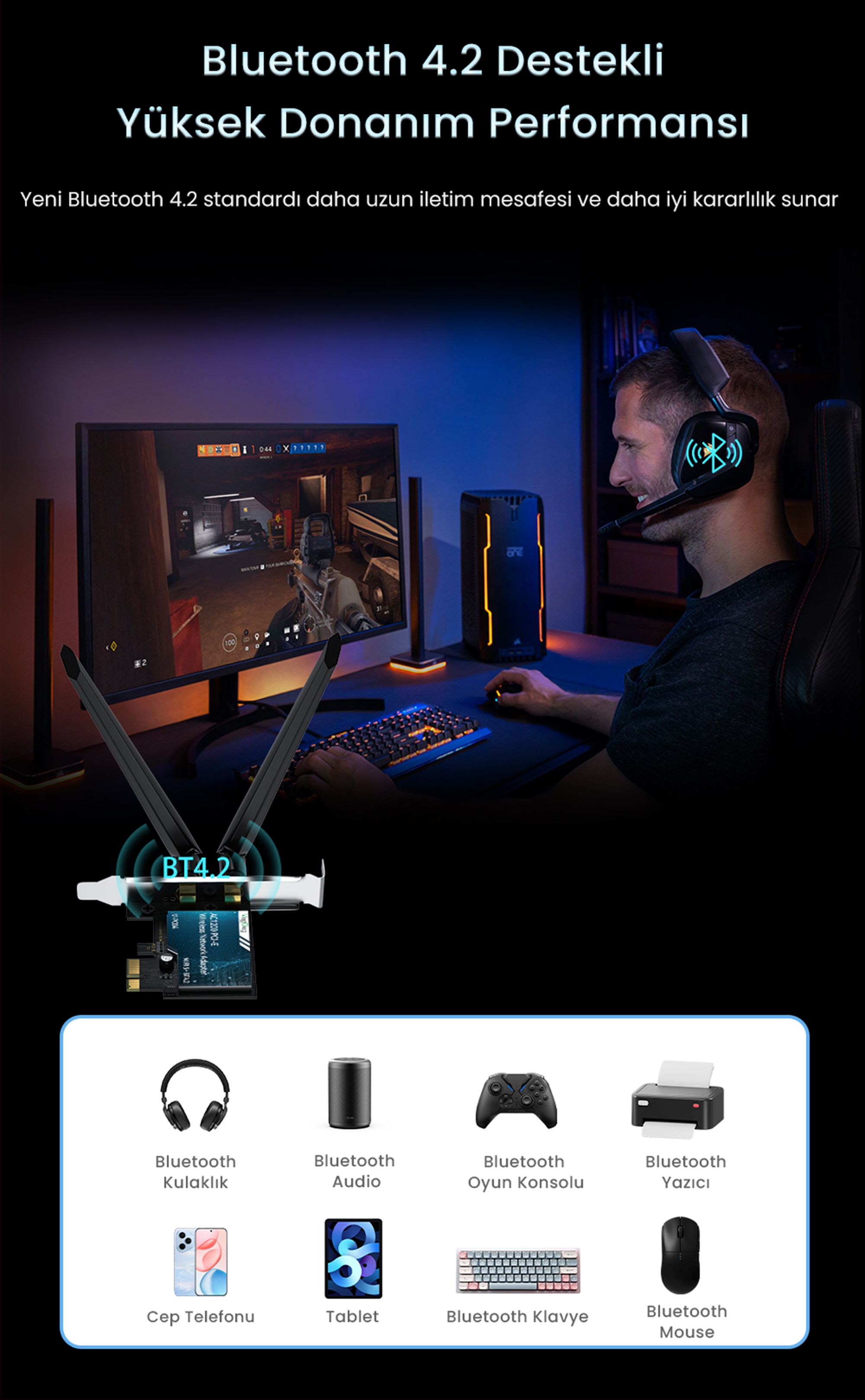 WiFi 5 (802.11ac) ve Bluetooth 4.2 teknolojilerini destekleyen adaptör, kablosuz internet bağlantısının yanı sıra Bluetooth özellikli cihazlarla bağlantı kurulmasına olanak tanır. Klavye, mouse, kulaklık ve benzeri Bluetooth cihazların bilgisayara bağlanmasını destekleyen yapısı ile kullanım alanını genişletir.