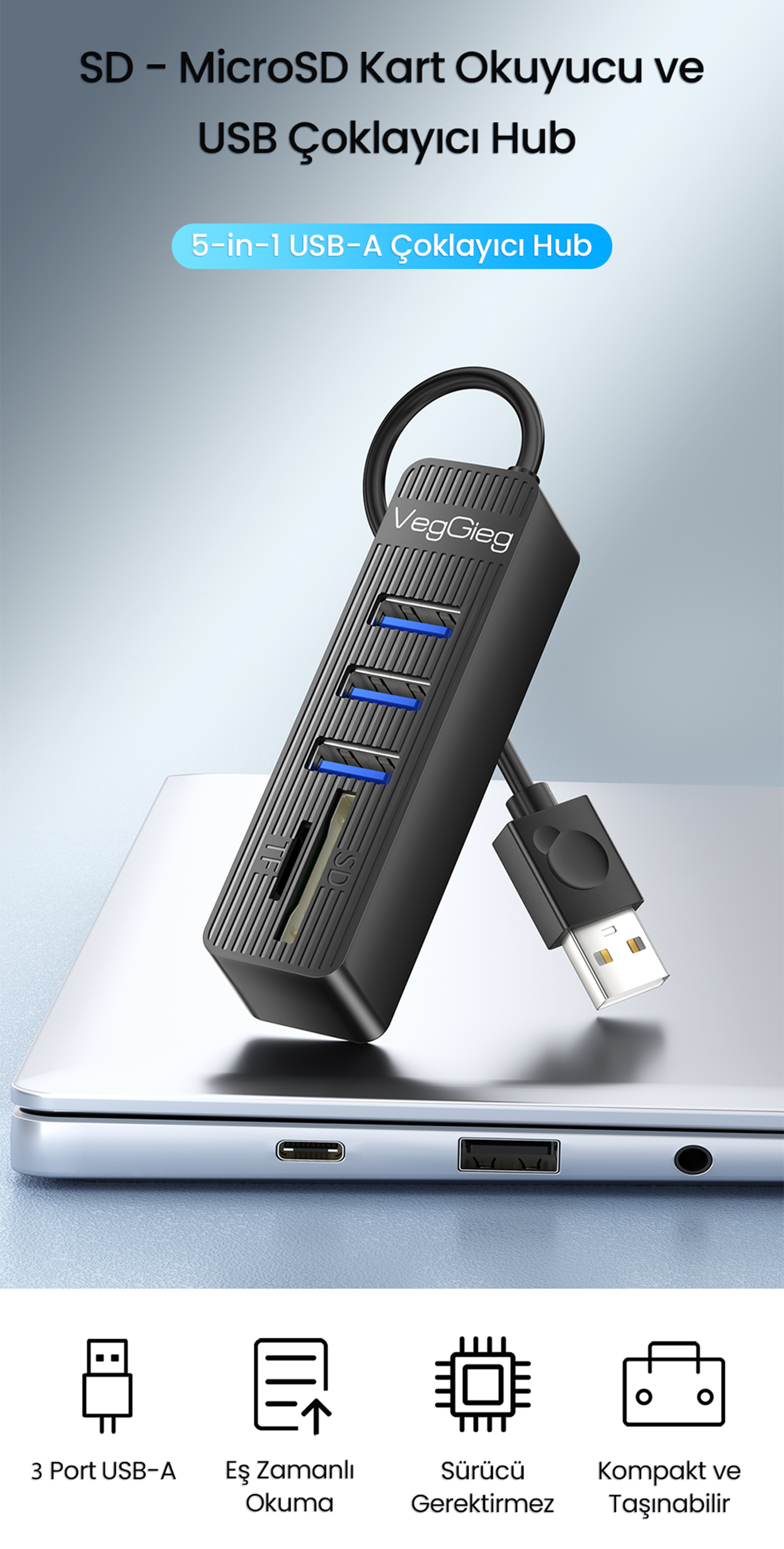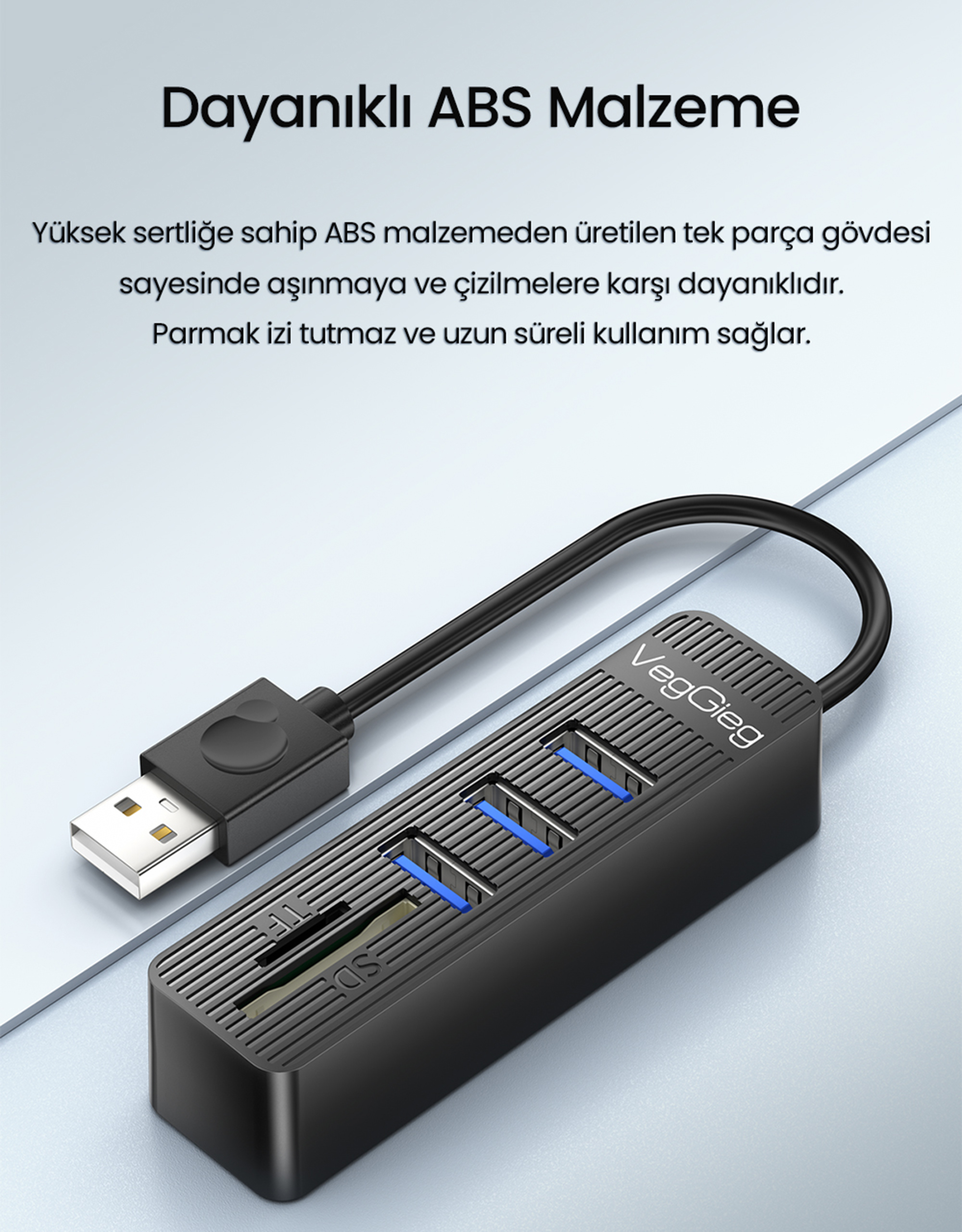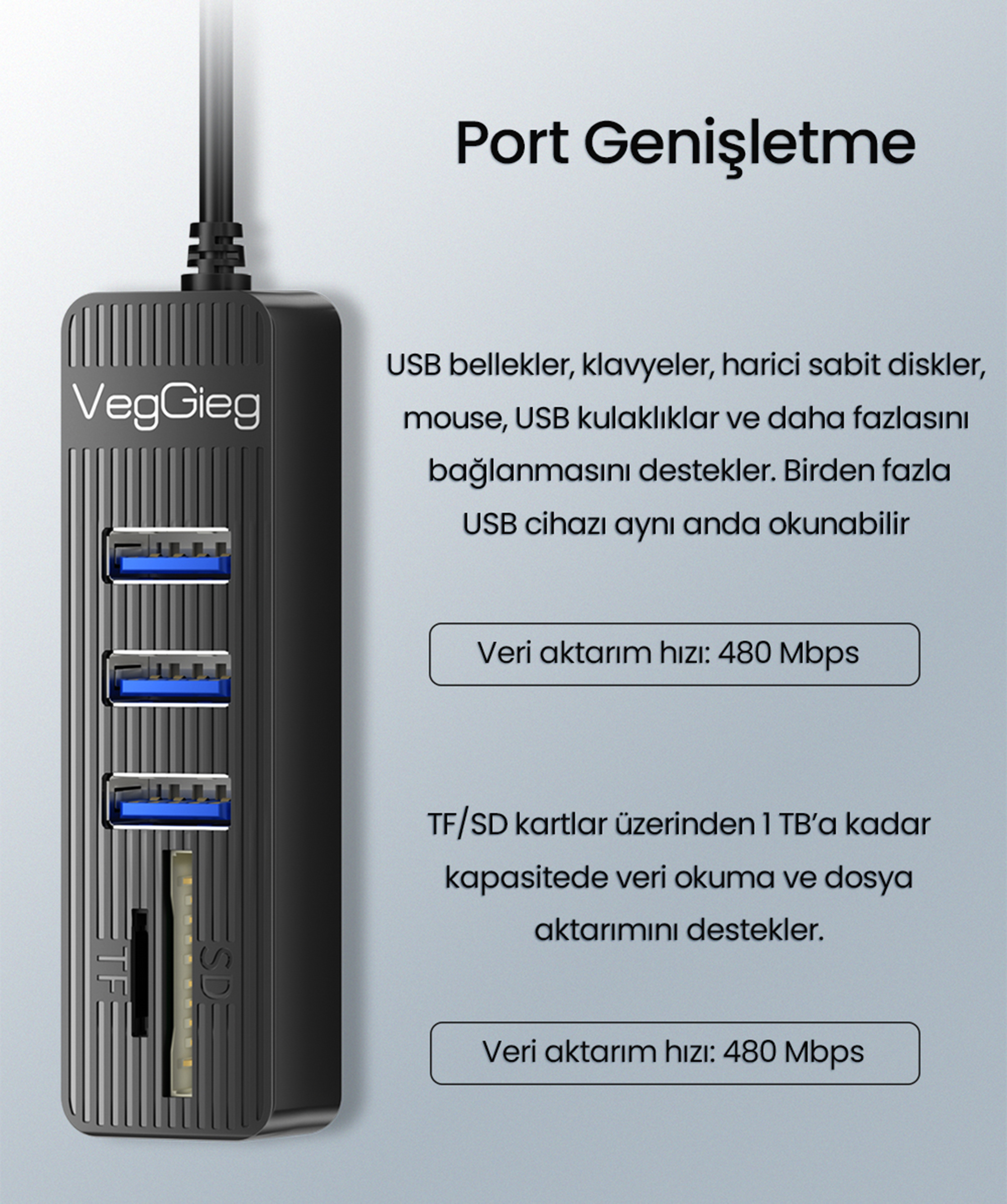 VegGieg C303 Çoklayıcı Hub, sınırlı sayıda USB portu olan cihazlarınız için ideal bir USB hub çözümüdür. Üzerindeki MicroSD ve SD kart girişleri sayesinde kart okuyucu olarak da kullanılabilir. 1TB’a kadar hafıza kartı desteği ve 480Mbps veri aktarım hızı ile dosyalarınızı hızlı ve güvenli bir şekilde transfer etmenizi sağlar. Kompakt ABS dış kasa tasarımı, cihazı dış etkenlere karşı korur ve taşınabilirliği artırır.