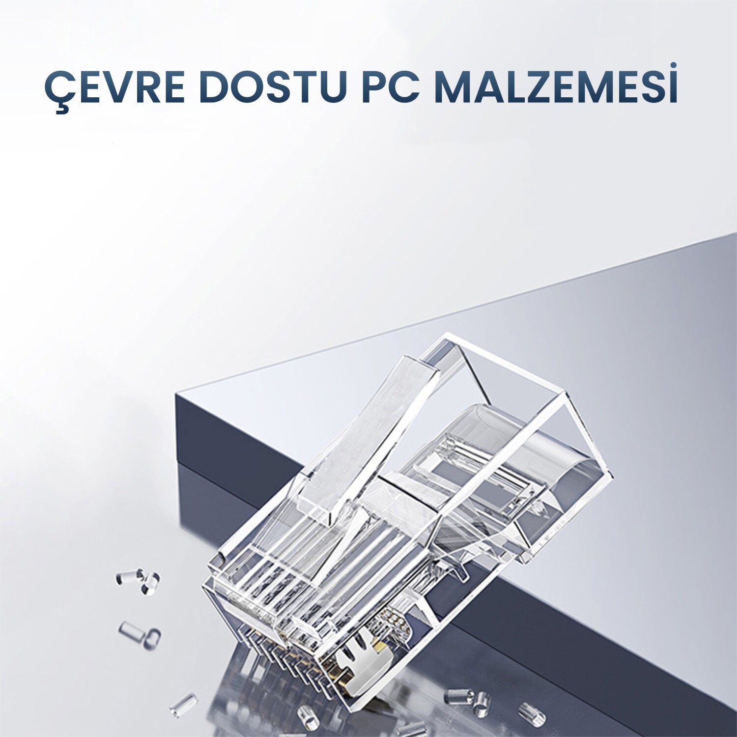 Her kutuda yer alan 100 adet RJ45 konnektör, 1000Mbps (1 Gigabit Ethernet) veri iletim desteğiyle yüksek performans sağlar. Altın kaplama üç çatallı klips (gold-plated trident clip) sayesinde korozyona karşı dirençli ve üstün sinyal iletkenliğine sahiptir. Yüksek tokluğa sahip şarapnel yapısı (high toughness shrapnel) ile kabloya sağlam şekilde tutunur, uzun ömürlü bağlantı sağlar.