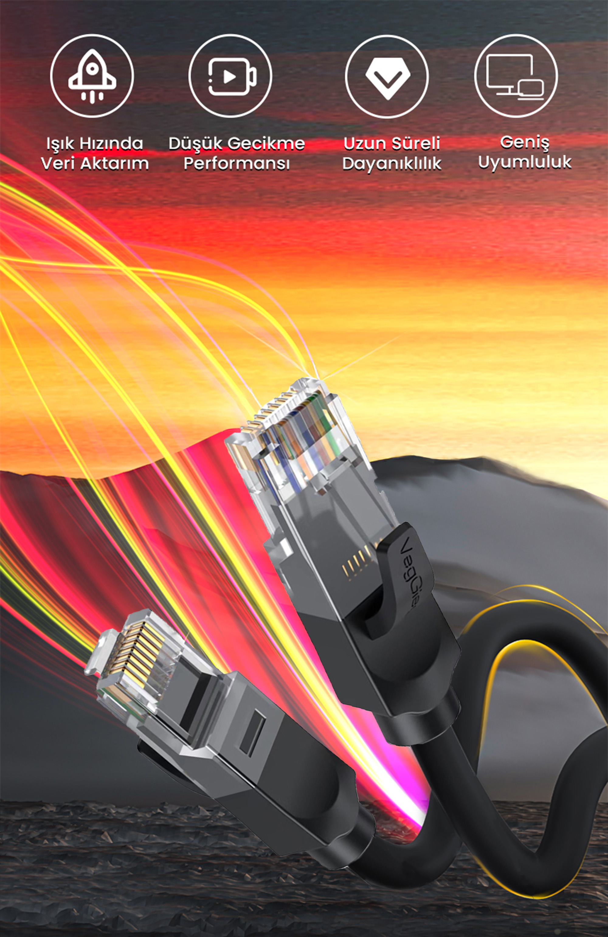 VegGieg CAT6 1000Mbps Gigabit UTP Ethernet Kablosu, yüksek hızlı ve istikrarlı internet bağlantısı isteyen kullanıcılar için özel olarak tasarlanmıştır. 1000Mbps veri aktarım hızı ile internet bağlantınızı en verimli şekilde kullanarak, kesintisiz indirme, yükleme ve çevrim içi oyun deneyimi sağlar. Bilgisayar, modem, router, TV veya oyun konsolu gibi cihazlarla tam uyumluluk sunan bu kablo, ev ve ofis ağları için profesyonel bir bağlantı çözümüdür.