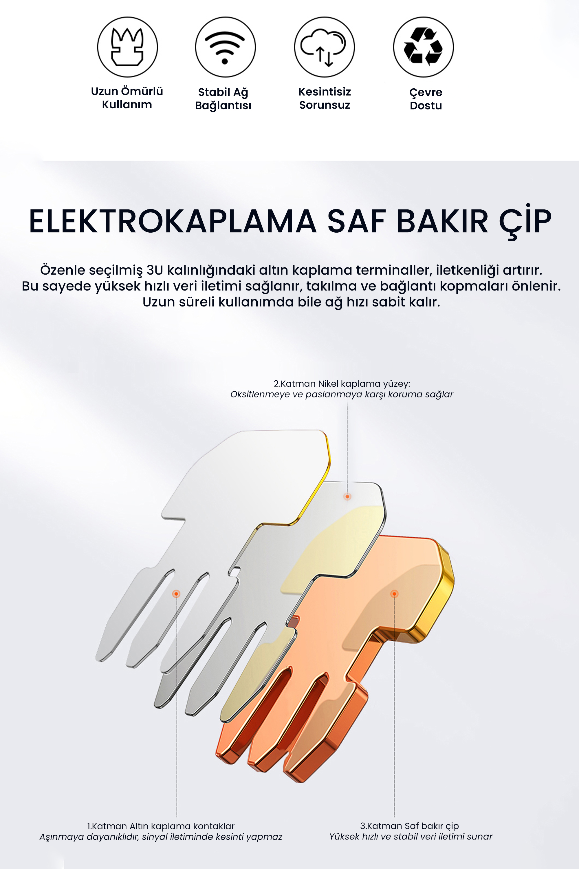 Altın kaplama üç dişli çip/pin yapısı, konnektör ile kablo damarları arasında güçlü ve kararlı bir temas oluşturulmasına yardımcı olur. Bu yapı, temas kaybını azaltmayı ve uzun süreli kullanımda bağlantı kalitesinin korunmasını hedefler. Yüksek iletkenlik gerektiren network bağlantıları için güvenilir bir temas yüzeyi sunar.