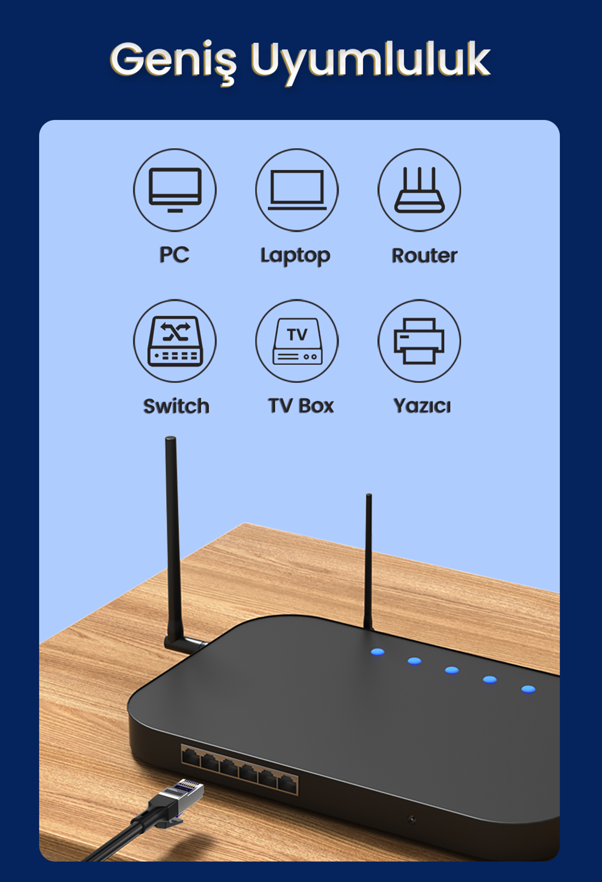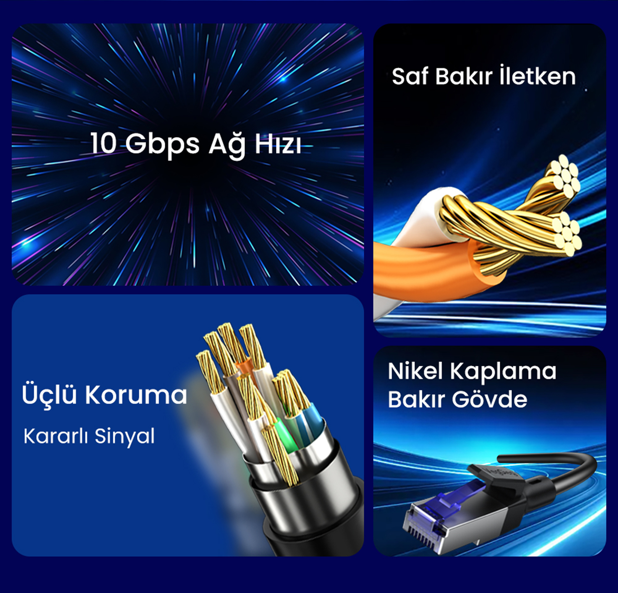 zlı veri iletimi gerektiren uygulamalar için tasarlanmıştır. 10Gbps veri transfer hızı ve 600 MHz frekans desteği, büyük dosya paylaşımları, çevrim içi oyunlar, video akışı ve profesyonel ağ çözümlerinde akıcı bir performans sağlar. CAT7 teknolojisi, modern internet altyapılarıyla uyumlu ve düşük gecikmeli bağlantı deneyimi sunar.Çift Korumalı F/FTP Yapı ile Daha Kararlı Bağlantı