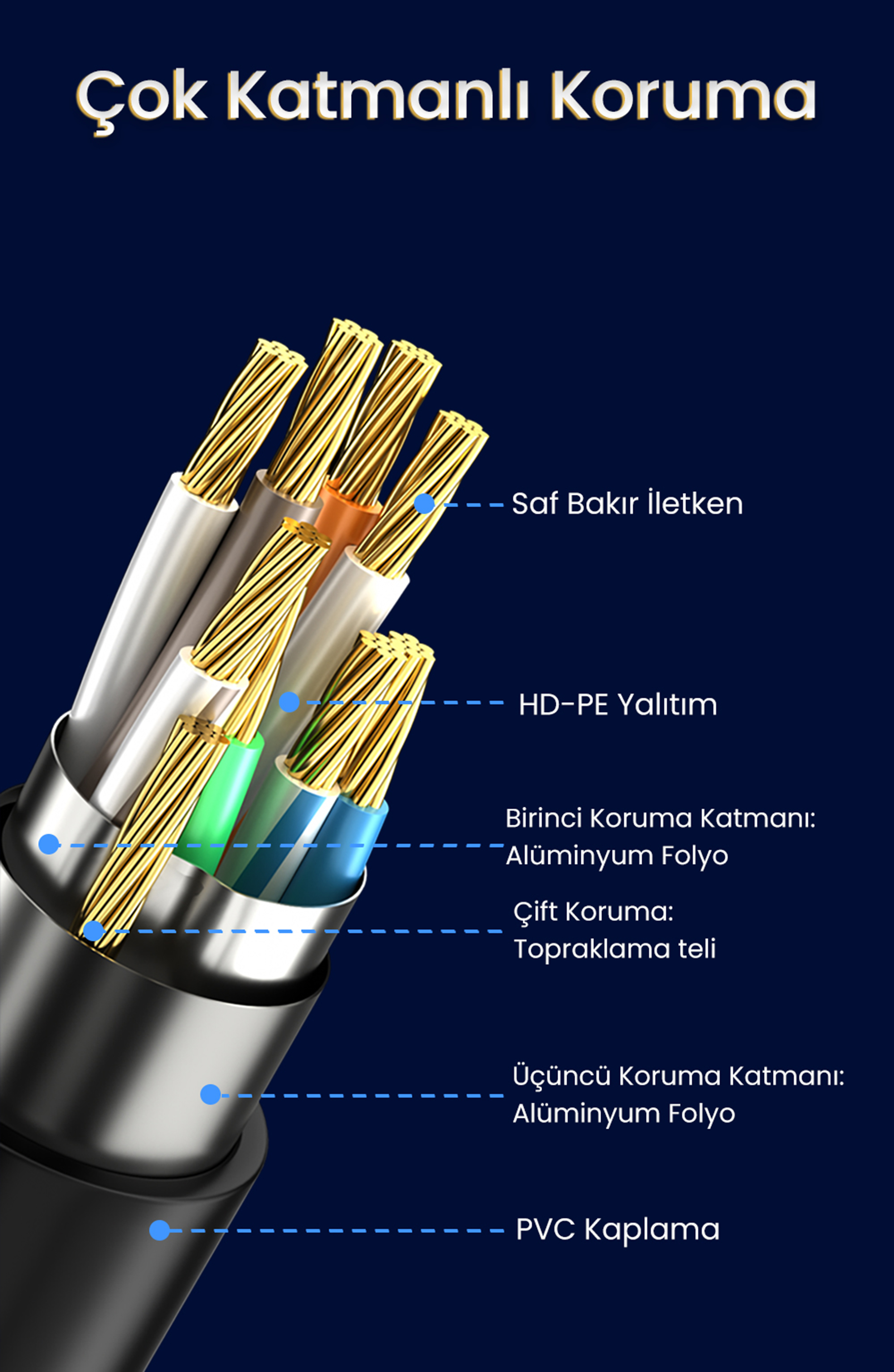 üzey, kablonun dış etkenlere karşı dayanıklılığını artırırken esnekliğini korur. Günlük kullanım, ofis ortamları ve profesyonel ağ sistemlerinde uzun ömürlü ve güvenli bir yapı sunarak kullanım süresini destekler.Ürün Özellikleri