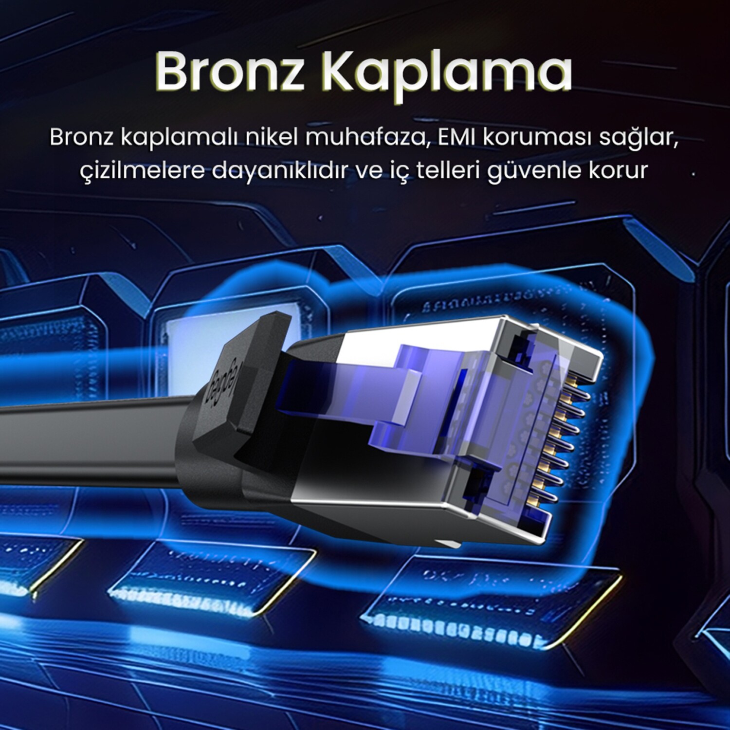 liği ile hızlı, stabil ve kesintisiz bir ağ bağlantısı sunmak üzere tasarlanmıştır. CAT7 standardı, yüksek performans gerektiren internet kullanımı ve ağ altyapıları için güvenilir bir çözüm sağlar. F/FTP çift ekranlamalı yapı (double shielding connector), elektromanyetik etkilere ve dış kaynaklı parazitlere karşı gelişmiş koruma sunarak veri iletimindeki olası kayıpları azaltır. Bu sayede yoğun kablolamanın bulunduğu ortamlarda dahi daha dengeli ve güvenilir bağlantı elde edilir. Flat (düz) ve esnek kablo formu, kapı altı, halı altı veya dar alanlarda kolay yönlendirme imkânı sunarak düzenli ve pratik bir kurulum sağlar.