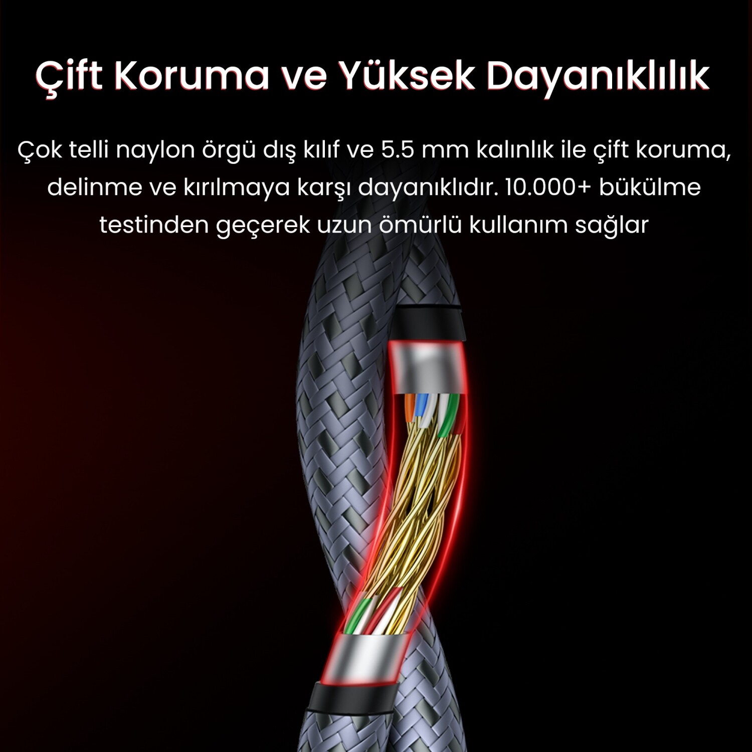 Dayanıklılıkta son nokta! Dış yüzeyi, bükülmelere, ezilmelere ve sert çekmelere karşı üstün koruma sağlayan "Solid Durable Fabric Cable" (Katı ve dayanıklı kumaş kablo) materyali ile zırhlandırılmıştır. Özel gri pamuklu (Grey cotton) şık örgü tasarımı, kabloya sadece estetik bir görünüm kazandırmakla kalmaz; aynı zamanda esneklik sağlayarak dar alanlarda bile hasar görmeden kıvrılabilmesine ve düğümlenmemesine olanak tanır.