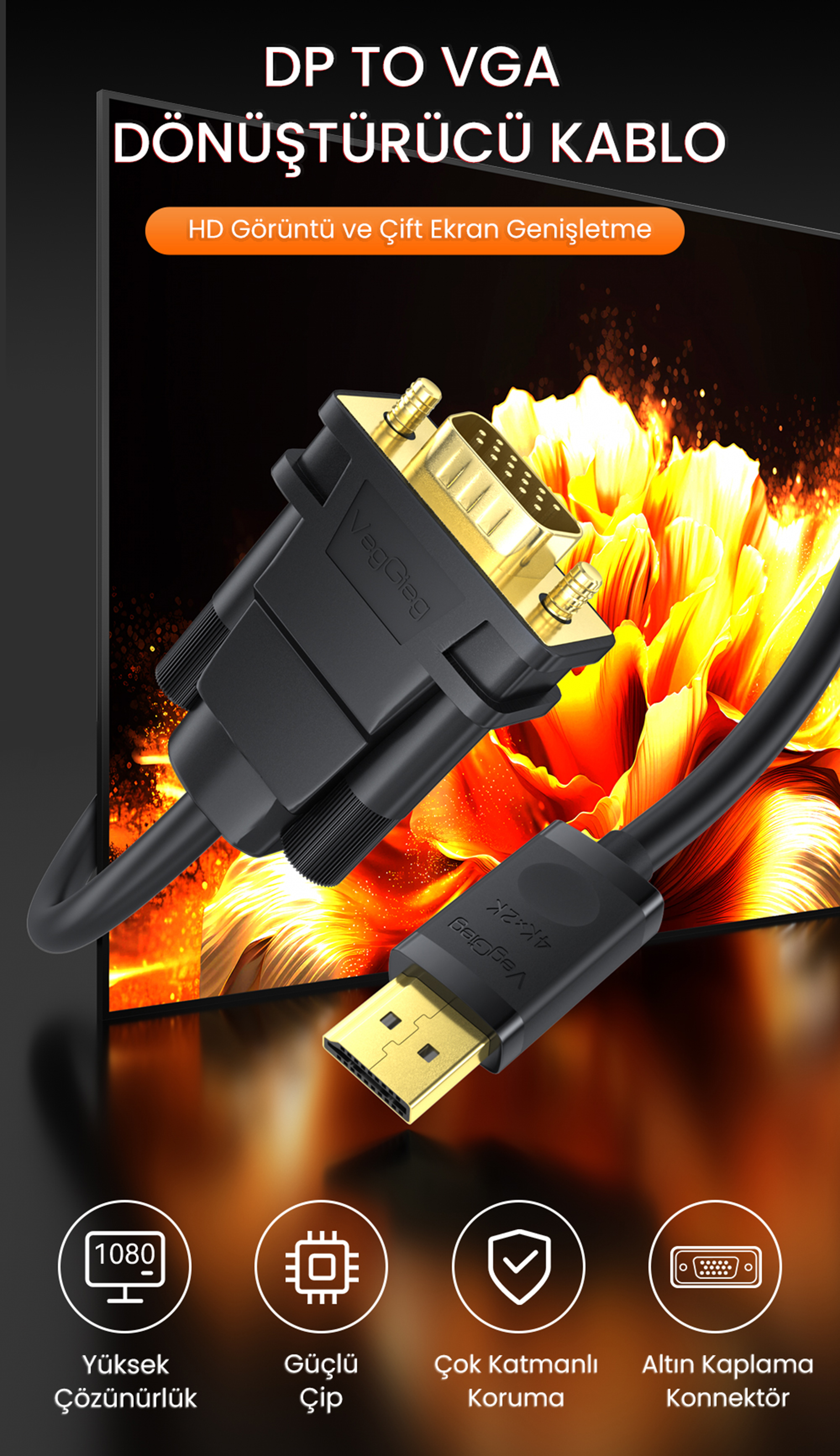 Modern bilgisayarlarınızın yüksek gücünü klasik ekranlarla buluşturun! DisplayPort to VGA Kablosu, yeni nesil ekran kartlarınızı veya dizüstü bilgisayarlarınızı VGA girişli monitörlere ve projeksiyon cihazlarına bağlamanın en kayıpsız ve pürüzsüz yoludur. İdeal uzunluğu ve üst düzey OFC (Oksijensiz Bakır) iletken yapısı sayesinde sinyal parazitlerini sıfıra indirir. İster ofiste profesyonel bir sunum yapıyor olun, ister evinizde çoklu monitör kurulumu (dual-monitor) inşa edin; bu kablo, aradaki dönüştürücü adaptör kalabalığını ortadan kaldırarak cihazlarınız arasında kusursuz bir senkronizasyon sağlar.