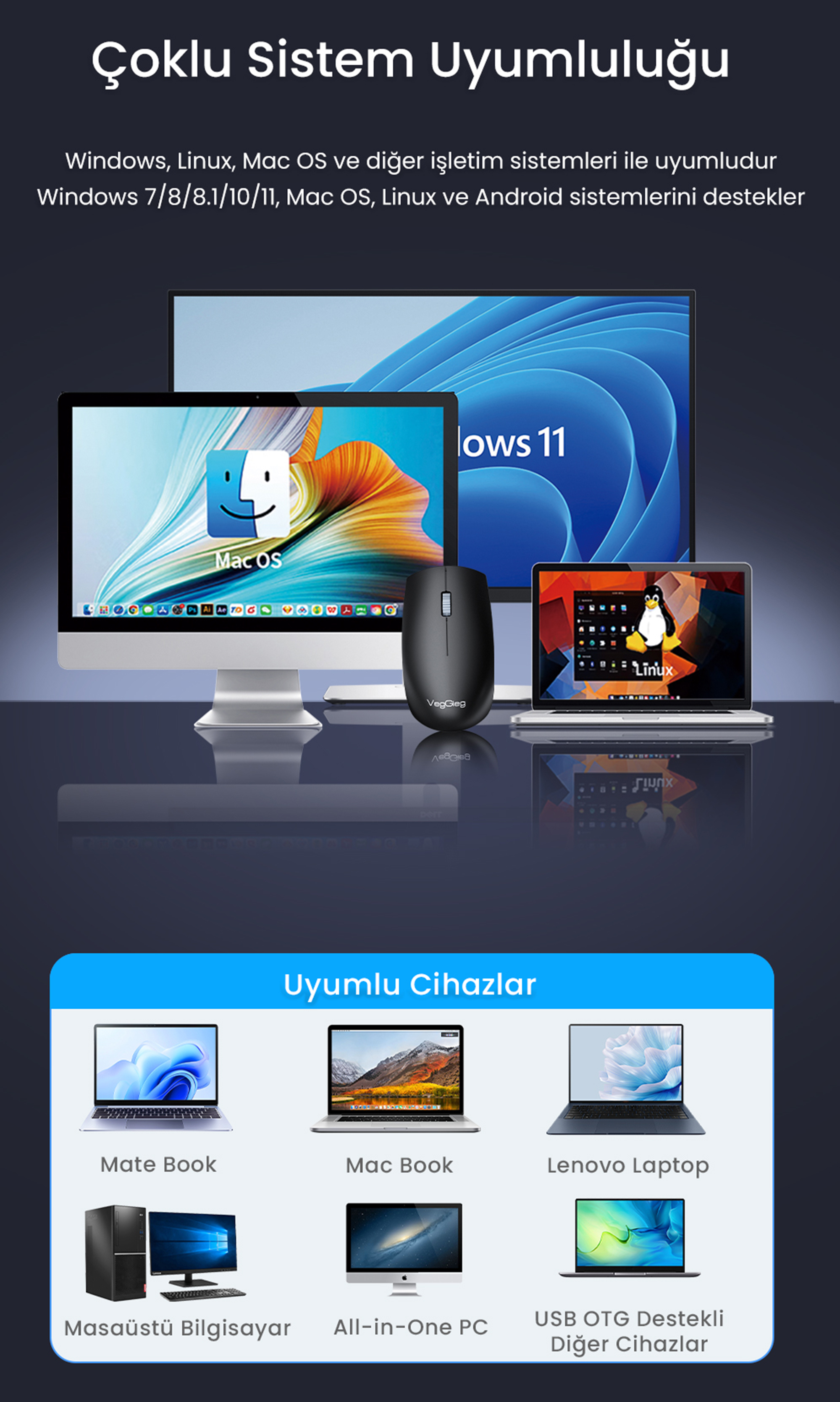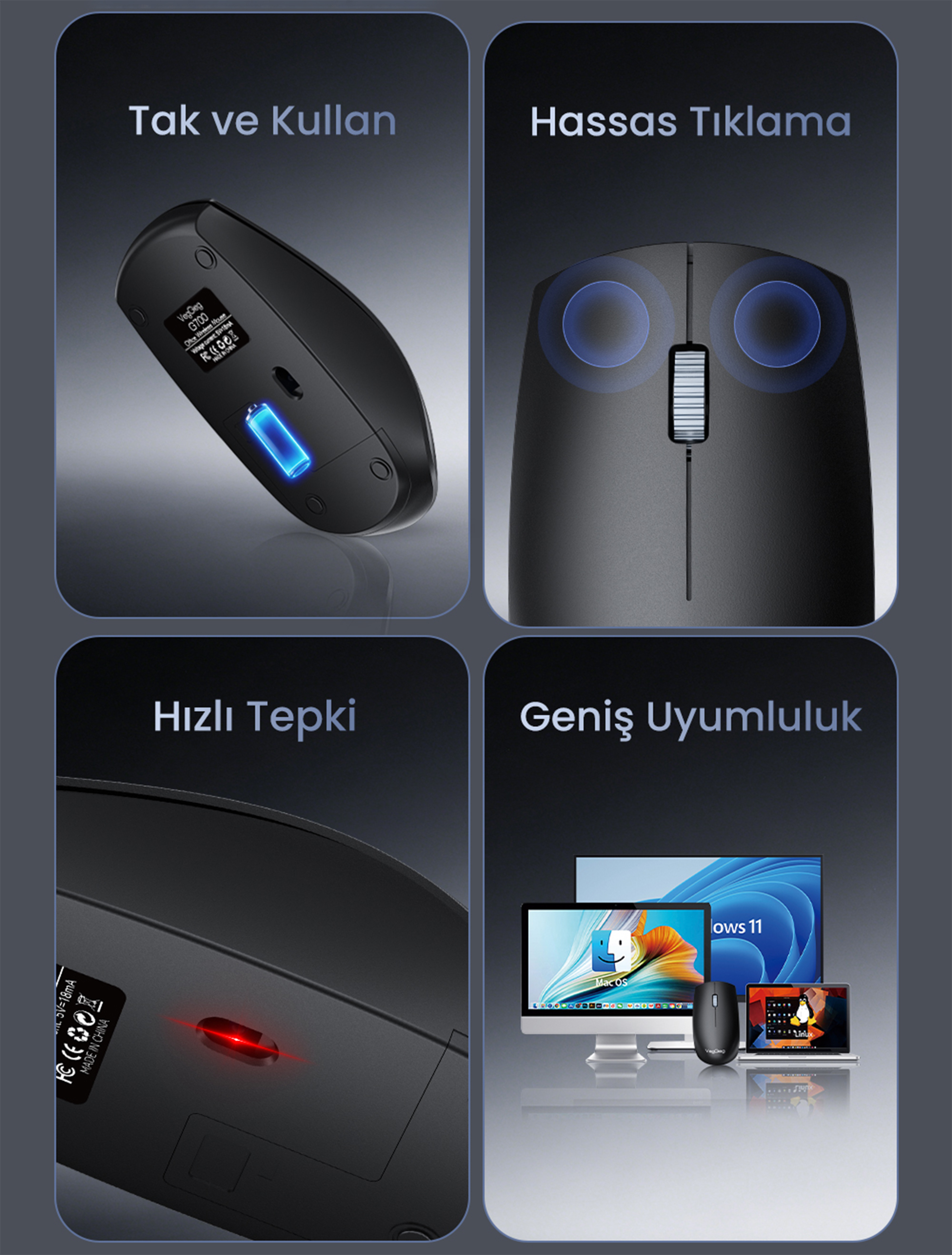 VegGieg G700, ekstra yazılım veya sürücü gerektirmeden plug & play özelliğiyle çalışır. USB alıcısı takıldığında otomatik olarak algılanır ve kullanıma hazır hale gelir. Bu özellik, hızlı kurulum ve pratik kullanım isteyen kullanıcılar için büyük avantaj sağlar.