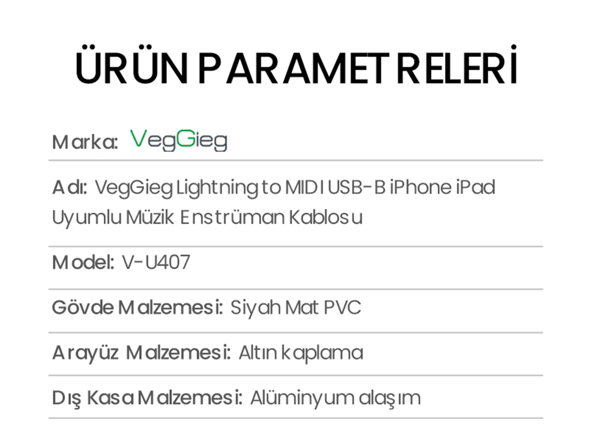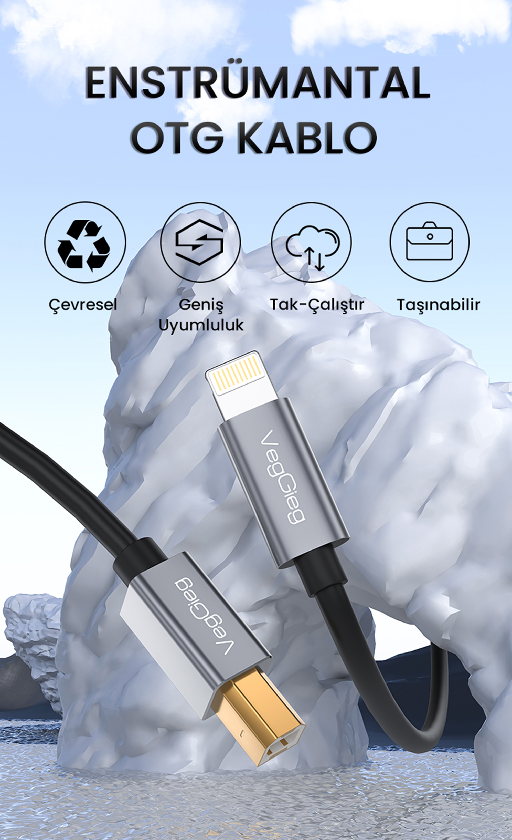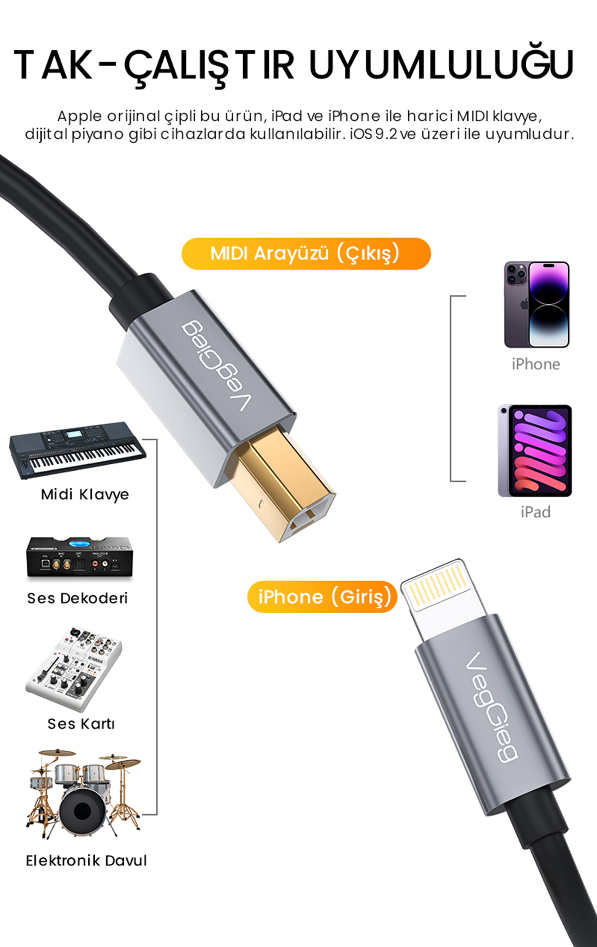 VegGieg Lightning to MIDI USB-B iPhone iPad Uyumlu Müzik Enstrüman Kablosu iPhone ve iPad kullanıcıları için geliştirilmiştir. Mobil cihazlarınızı elektronik piyano, MIDI klavye veya elektronik davul gibi uyumlu enstrümanlara zahmetsizce bağlamanızı sağlar. Tak ve çalıştır özelliği sayesinde ekstra sürücü veya yazılım gerektirmeden doğrudan bağlantı sunar; böylece müzik üretimine anında başlayabilirsiniz. Dayanıklı yapısı, düşük gecikmeli veri aktarımı ve üstün ses kalitesi ile hem amatör hem de profesyonel müzisyenler için ideal bir çözümdür.