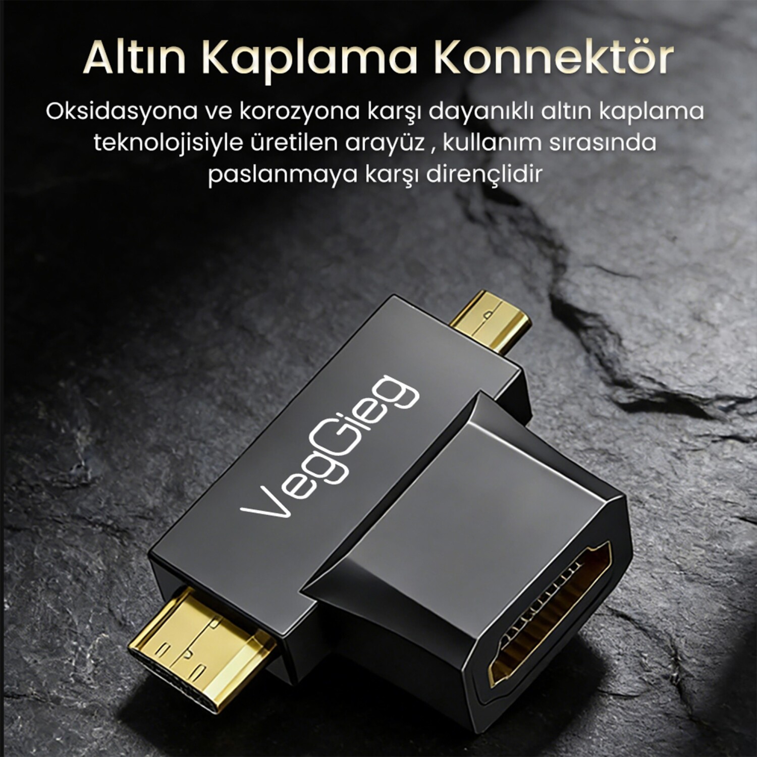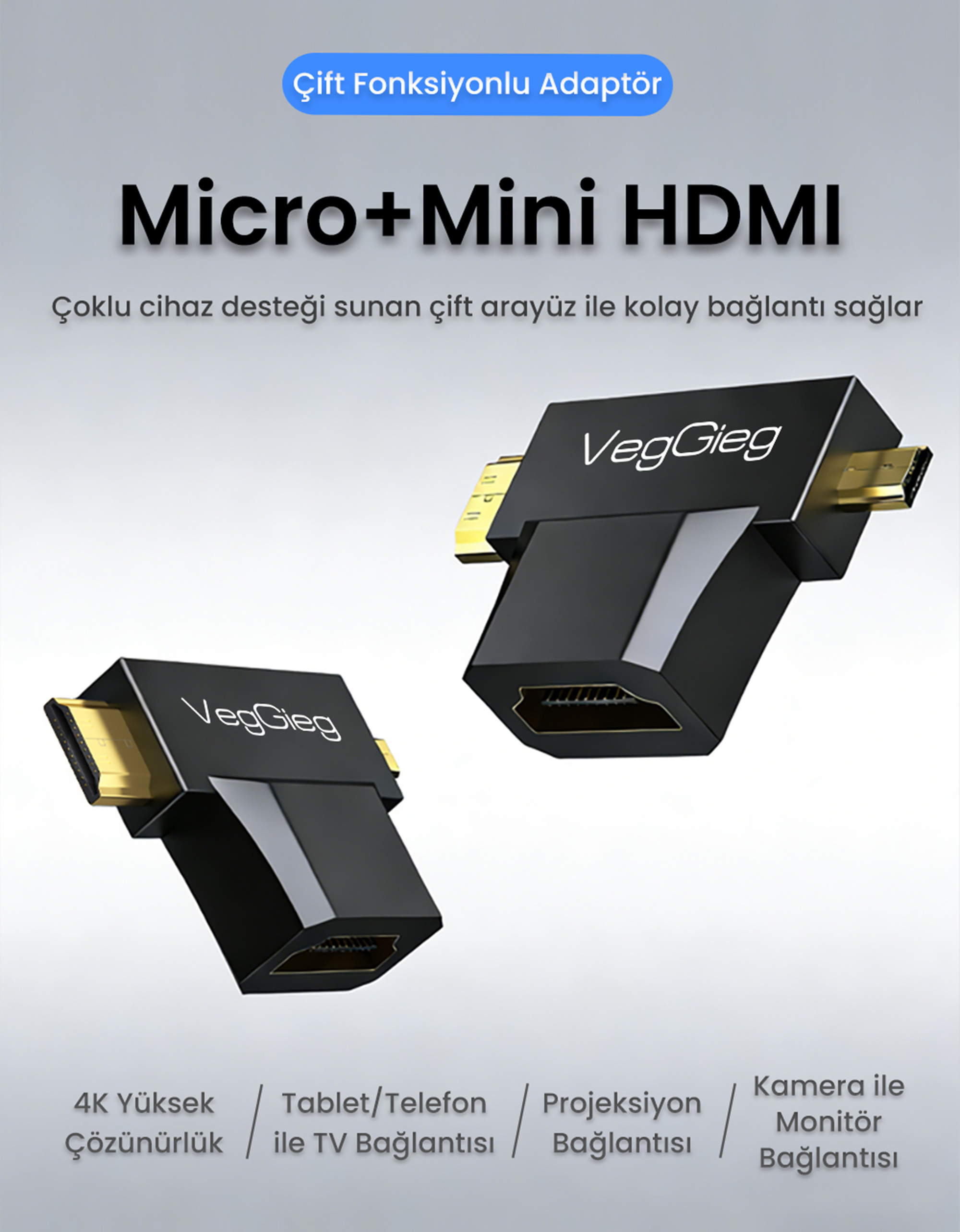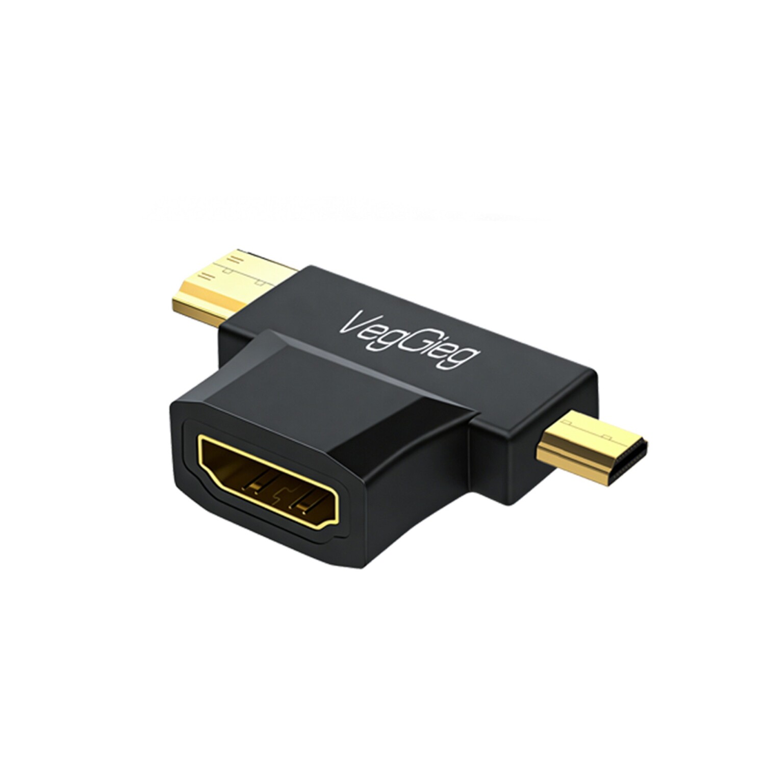 VegGieg HDMI 2 in 1 Adaptör, standart HDMI bağlantısını Mini HDMI ve Micro HDMI girişlerine dönüştürmek için tasarlanmış pratik bir çözümdür. T şeklindeki adaptör yapısı, tek bir HDMI dişi giriş üzerinden iki farklı HDMI erkek çıkış sunarak farklı cihazlarla uyumlu kullanım imkânı sağlar. Kompakt tasarımı sayesinde kablo karmaşasını azaltır ve taşınabilir bir bağlantı çözümü sunar.