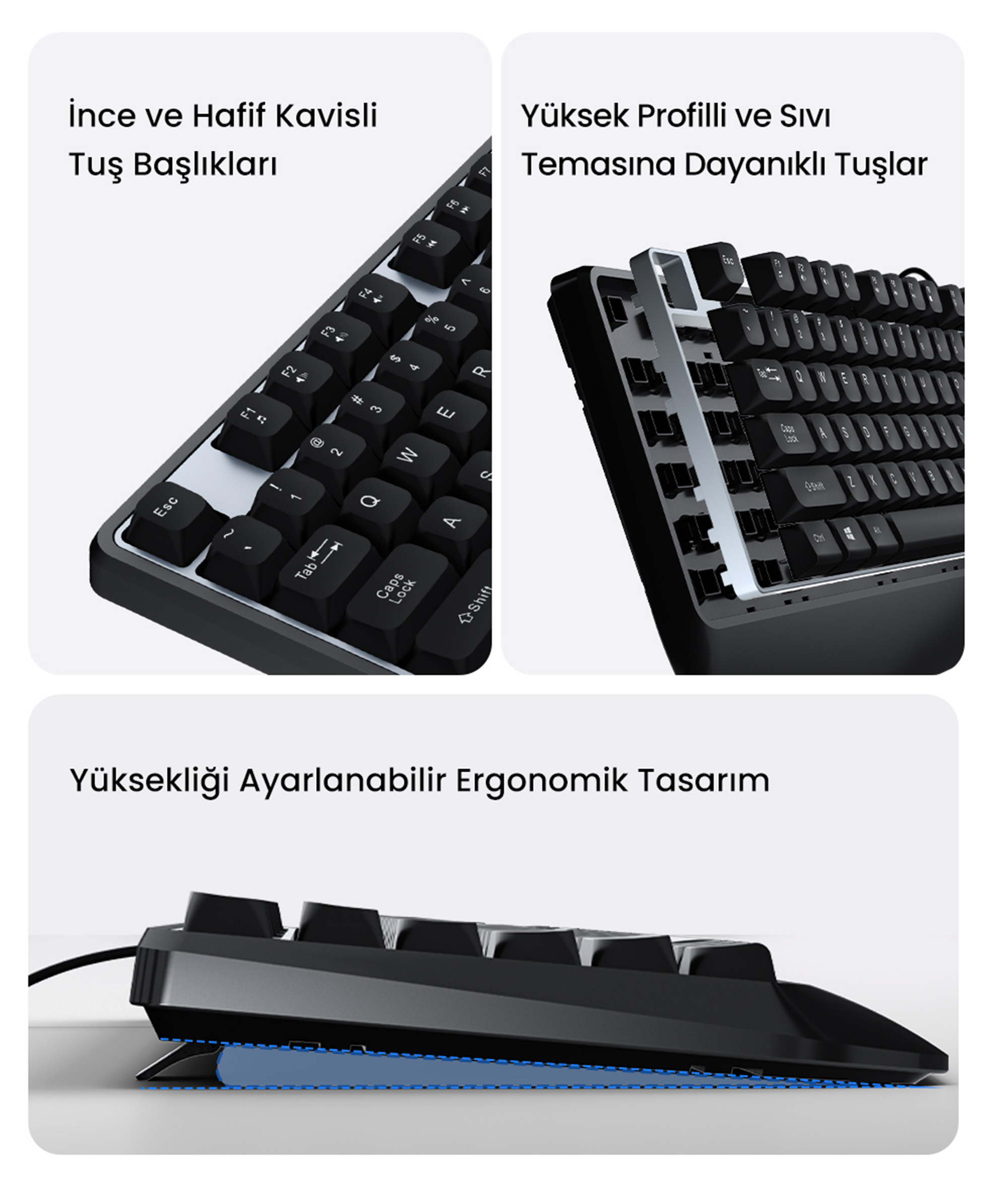 İş istasyonunuzda kahve veya su içmek artık bir risk değil. Klavye, sıvı dökülmelerine karşı dirençli (Waterproof) özel bir gövde yapısına sahiptir. Yüksek profilli tuşlar sıvıların iç devrelere ulaşmasını engeller. Ayrıca tuşların üzerindeki harf ve rakamlar, yoğun kullanıma karşı aşınmayı önleyen lazer oyma teknolojisi (Radiation carving technology) ile işlenmiştir; yıllar geçse de tuş silinmesi sorunu yaşatmaz.