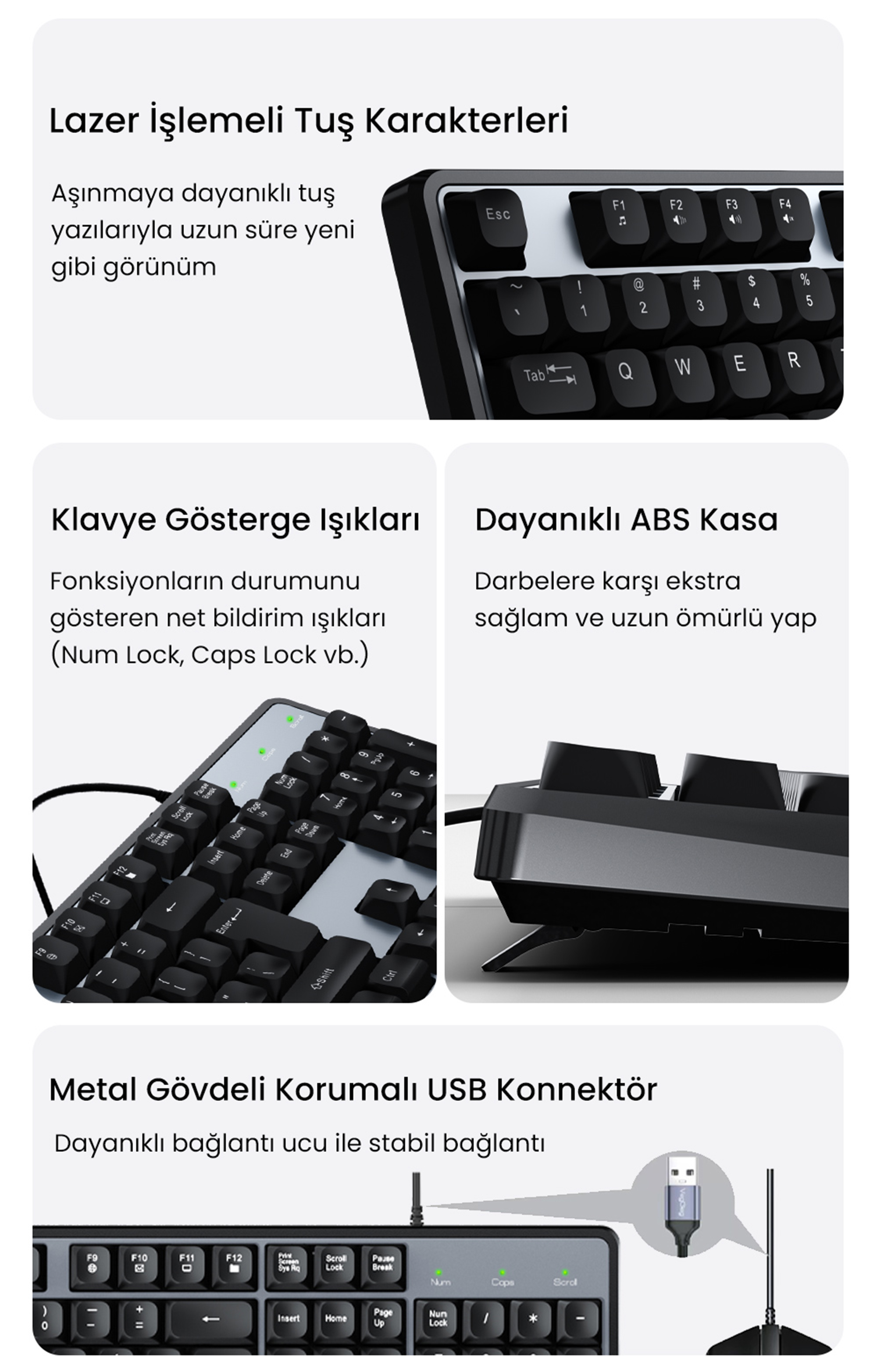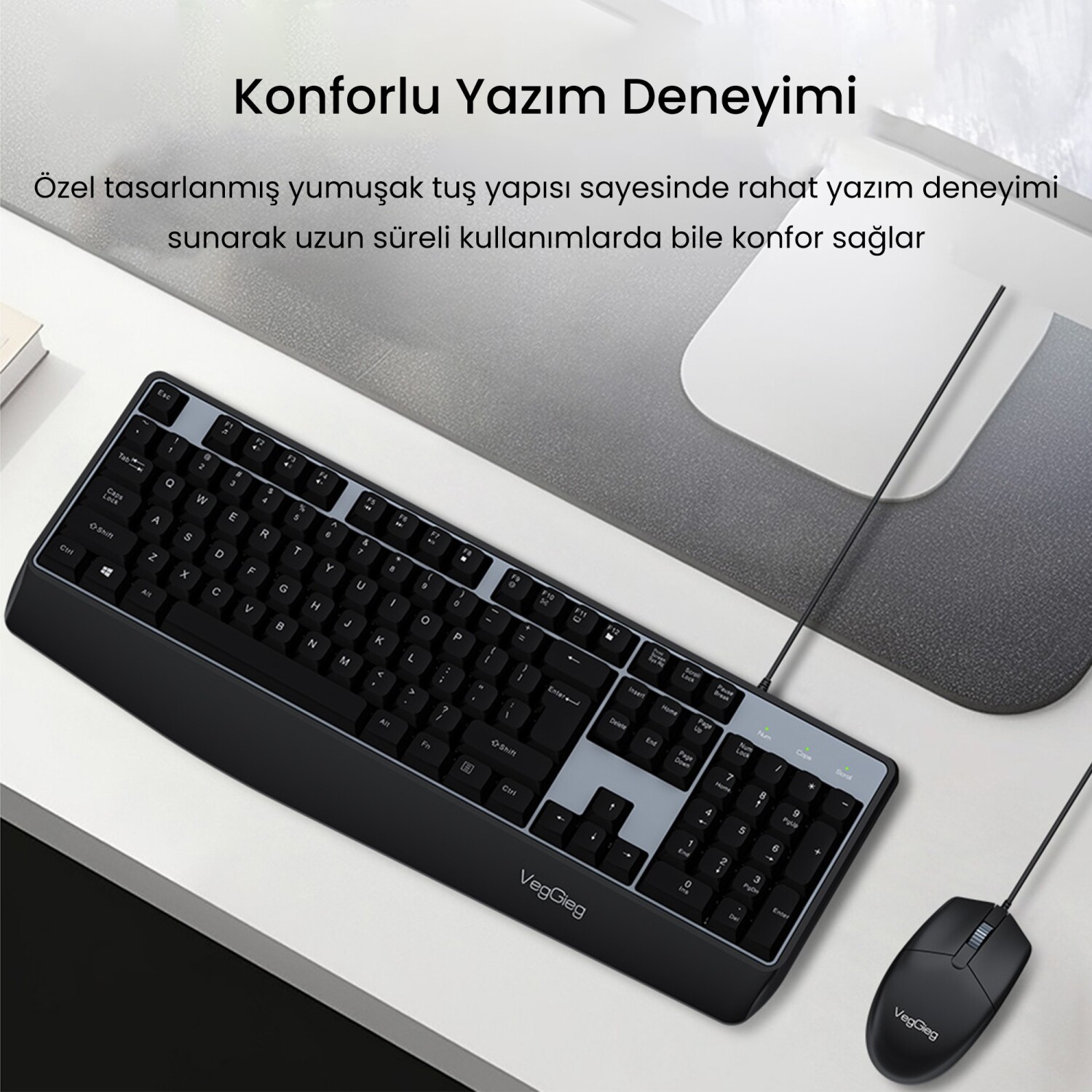 VegGieg MK500A Business Office Kablolu Klavye ve Mouse Seti, yoğun iş temposundaki en güvenilir donanımınız olacak. Açık ofislerde, kütüphanelerde veya gece evden çalışmalarınızda çevreye rahatsızlık vermenizi engelleyen özel sessiz tuş teknolojisi (Silent Design) ile odaklanmanızı zirveye taşır. Tam boyutlu Türkçe Q dizilimine sahip klavye, ofis kazalarına karşı sıvı dökülmelerine dayanıklı yüksek tuş profili ve yıllarca silinmeyen lazer oyma karakter teknolojisi ile uzun ömürlü bir kullanım vadeder. Sete dahil olan yüksek hassasiyetli optik mouse ise metal kaydırma tekerleği ve hem sağ hem sol el kullanımına uygun simetrik yapısıyla elinizi yormaz. Her iki cihazda da standartların ötesine geçilerek kullanılan 1.8 metre uzunluğundaki metal korumalı (Shielded) dayanıklı USB kablolar, kopma ve sinyal paraziti sorunlarını tamamen ortadan kaldırır. Ekstra bir yazılım gerektirmeyen tak-çalıştır yapısıyla masaüstü ve dizüstü bilgisayarlarınızda anında kullanıma hazırdır.
