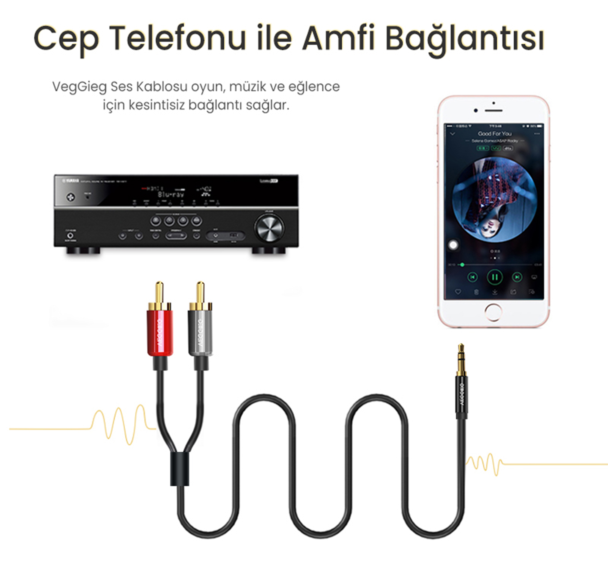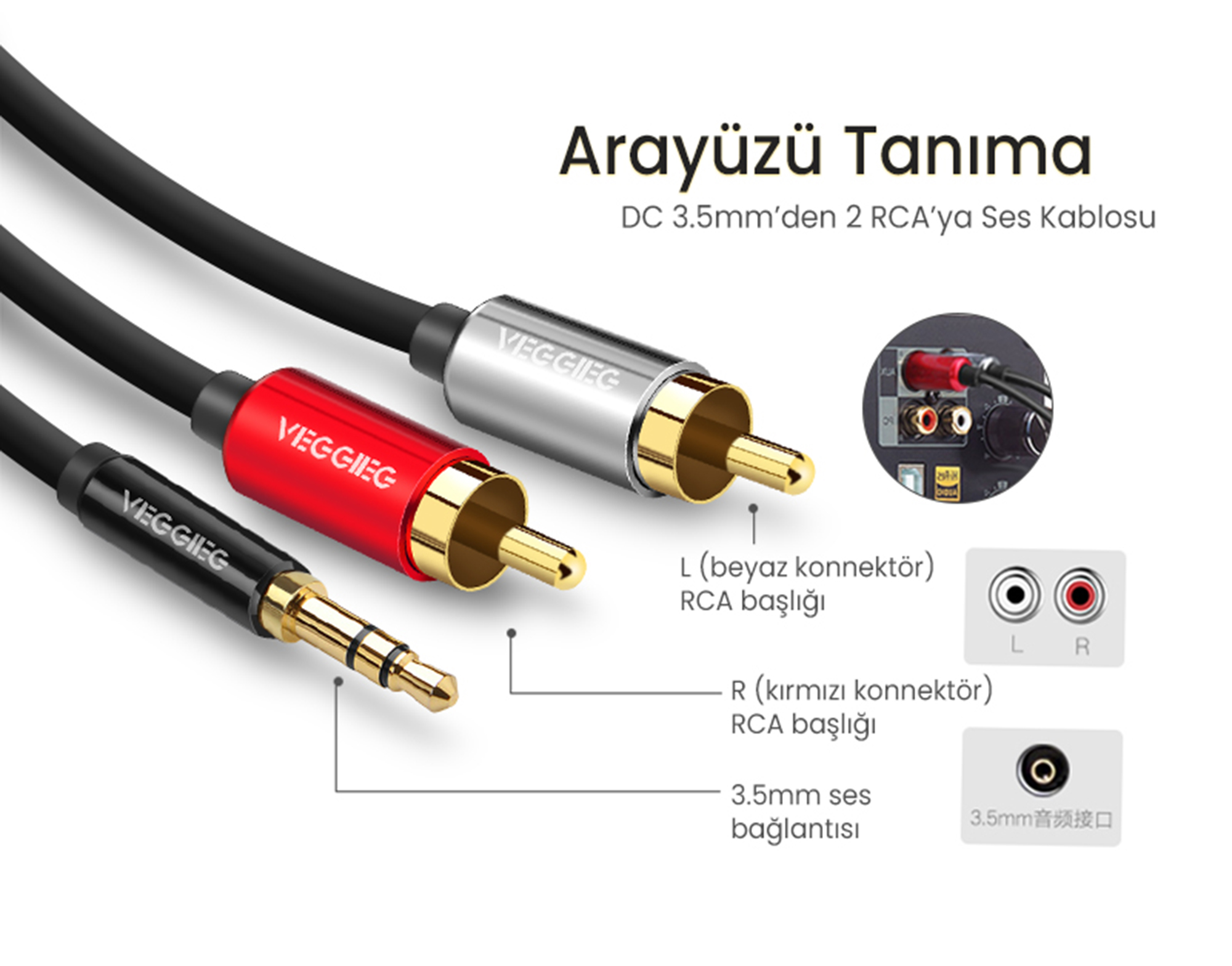 VegGieg 3.5mm AUX to 2 RCA Ses Kablosu, ses kaynaklarınızı yüksek kaliteli ses sistemlerine güvenle bağlamanızı sağlar. Bilgisayar, televizyon, cep telefonu ve DVD oynatıcı gibi cihazlardan, amfi, müzik seti, hoparlör ve ses kayıt cihazlarına kadar geniş bir kullanım alanı sunar. Hem ev hem profesyonel ortamlarda güçlü ve temiz ses iletimi için ideal bir çözümdür.