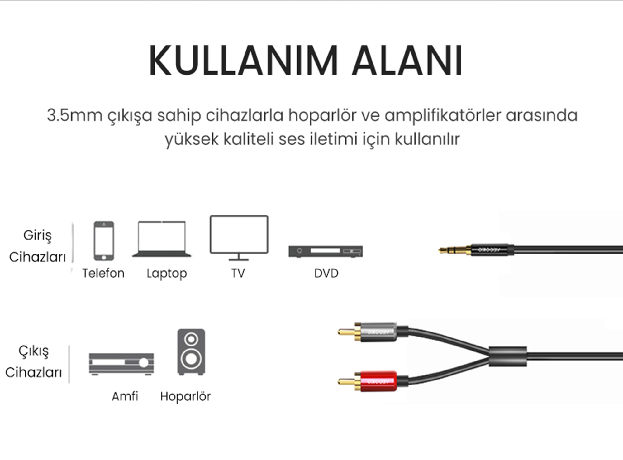 3.5mm stereo jack çıkışı olan tüm cihazlarla uyumlu olan, RCA girişli ses sistemleri ile sorunsuz şekilde çalışır. Ev sinema sistemlerinden stüdyo ekipmanlarına kadar birçok alanda güvenle kullanılabilir.