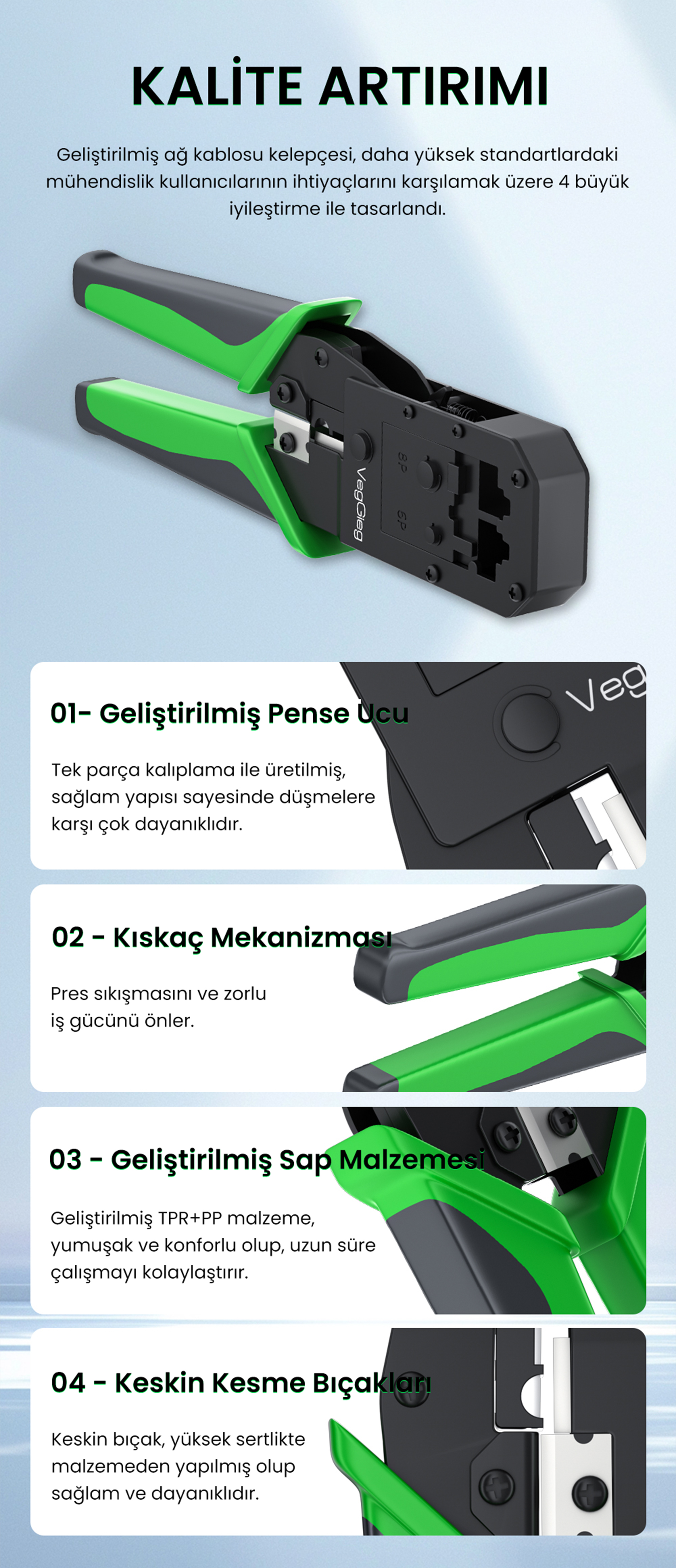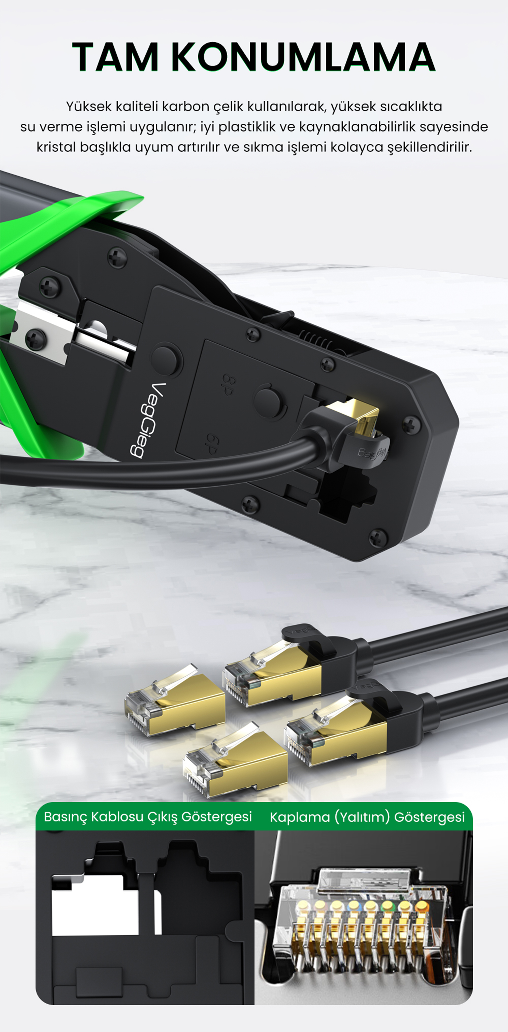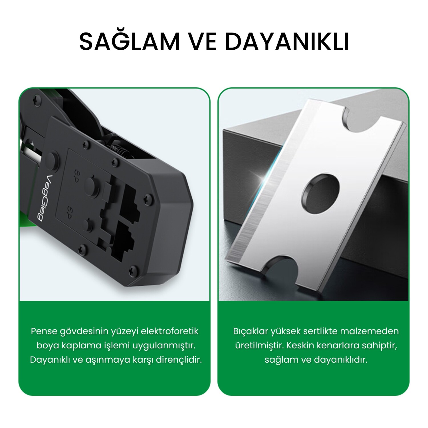 VegGieg V-E103 Profesyonel Sıkma Pensesi; kesme, soyma ve presleme işlemlerini tek bir dayanıklı el aletinde birleştirerek teknisyenlerin ve ağ kurulumcularının iş akışını mükemmelleştirir. Yeni nesil Cat6, Cat7 ve hatta Cat8 ethernet kablolarıyla kusursuz uyum sağlayan bu alet, keskin bıçak yapısı sayesinde iç tellere zarar vermeden en temiz kablo işçiliğini çıkarmanıza olanak tanır. Ağır hizmet tipi çelik alaşım gövdesiyle uzun yıllar boyunca alet çantanızın vazgeçilmezi olacak.