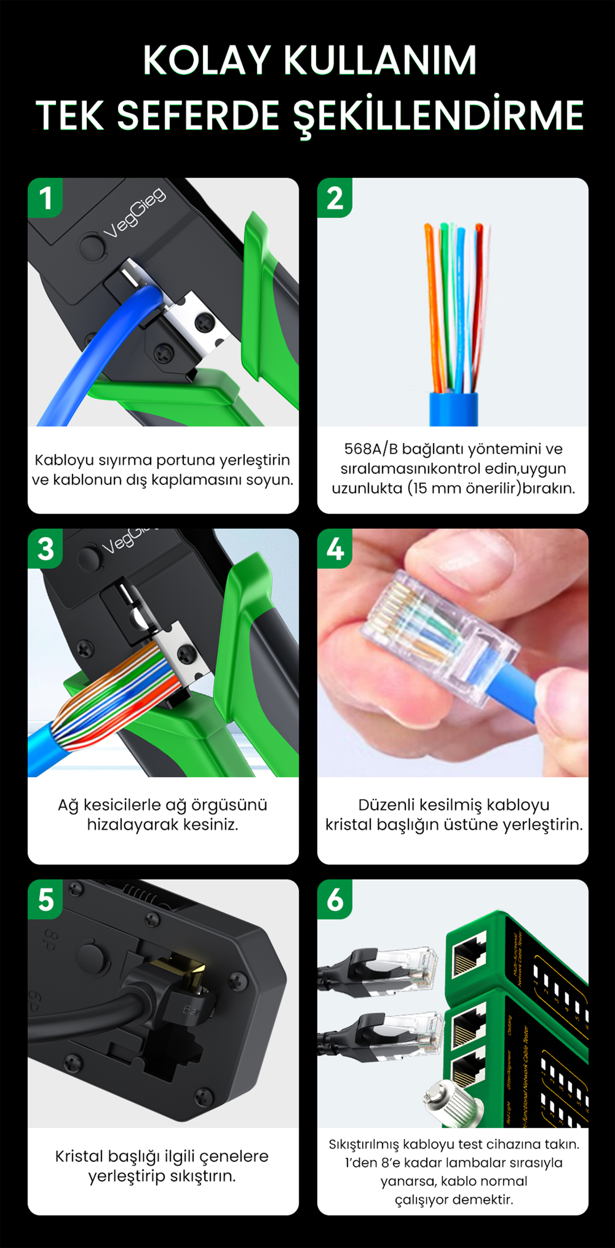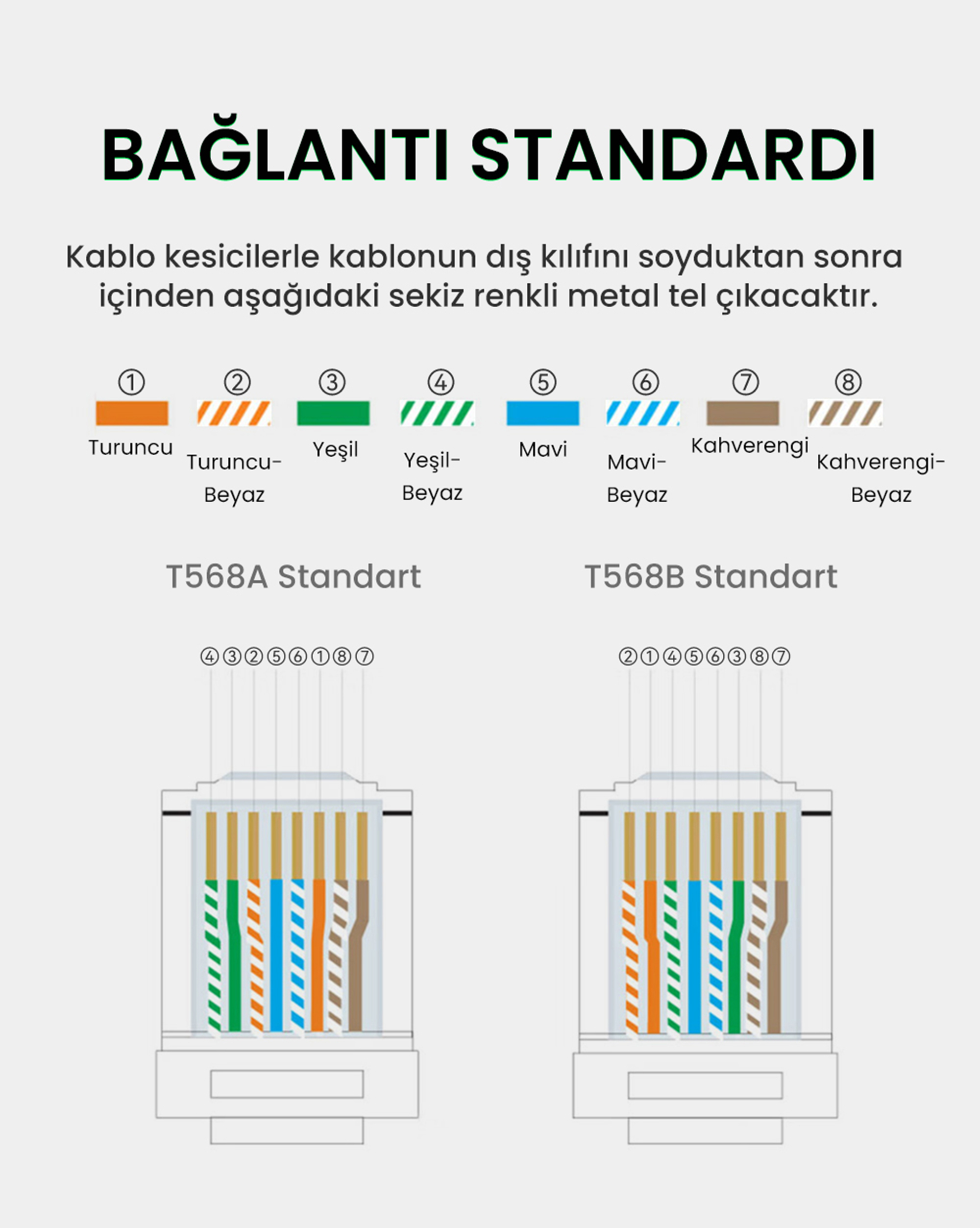 Desteklenen Konnektörler: RJ45 (8 Pin - 8P) ve RJ11 (6 Pin - 6P)
