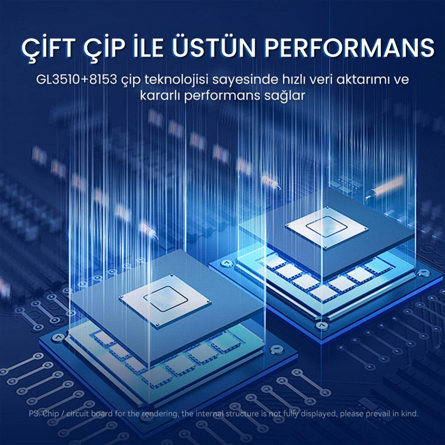 Şık alüminyum kasa, dış darbelere karşı dayanıklılık sağlarken aynı zamanda ısıyı dağıtarak HUB’ın daha serin ve stabil çalışmasına yardımcı olur. 15 cm kablo uzunluğu kullanım kolaylığı sağlar.