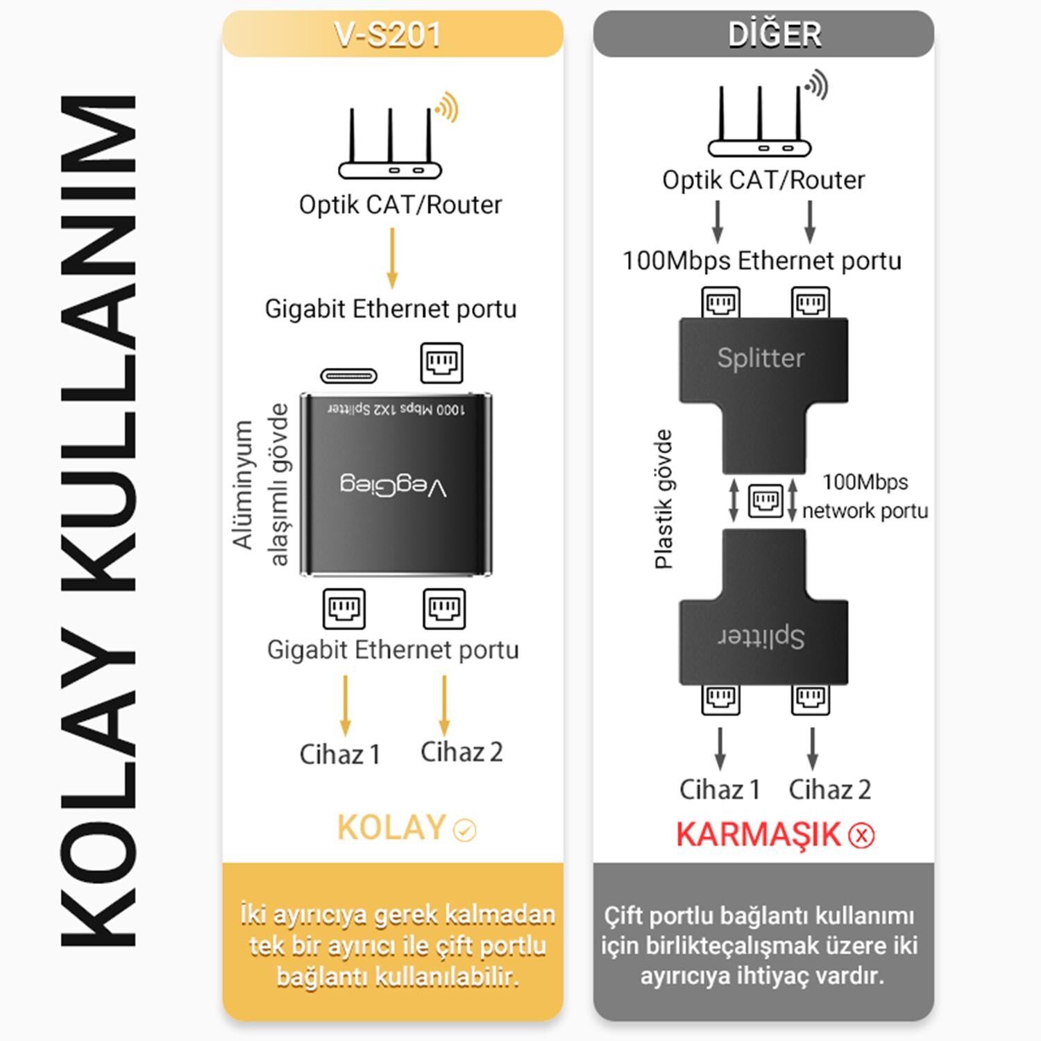 VegGieg RJ45 Gigabit Ethernet Çoklayıcı Splitter Adaptör, tek bir Ethernet portunu iki ayrı çıkışa dönüştürmenizi sağlar. Bu adaptör sayesinde, yönlendiricinizi veya Ethernet anahtarınızı aynı anda iki farklı cihaza bağlayabilirsiniz. 1000Mbps aktarım hızı sayesinde internetinizi dar boğaz sorunu olmadan ulaşabileceğiniz en yüksek hızda kullanmanızı sağlar. Ayrıca, 100 metreye kadar internet iletimi yapabilir.