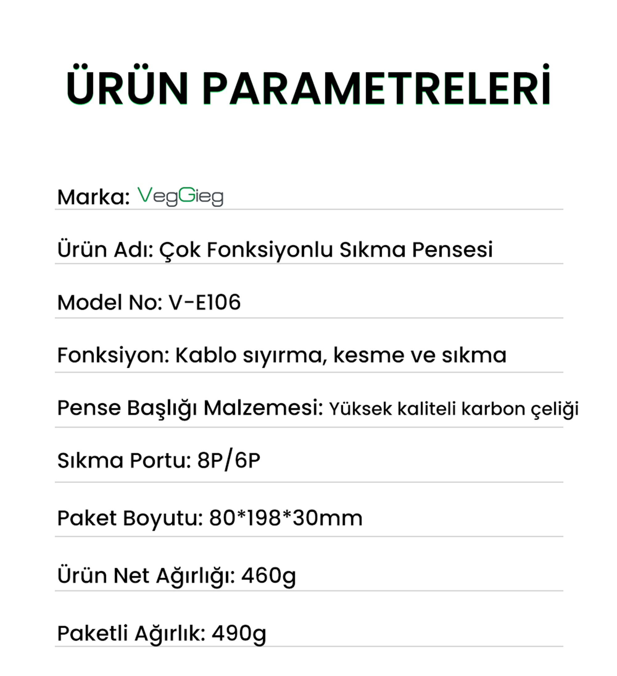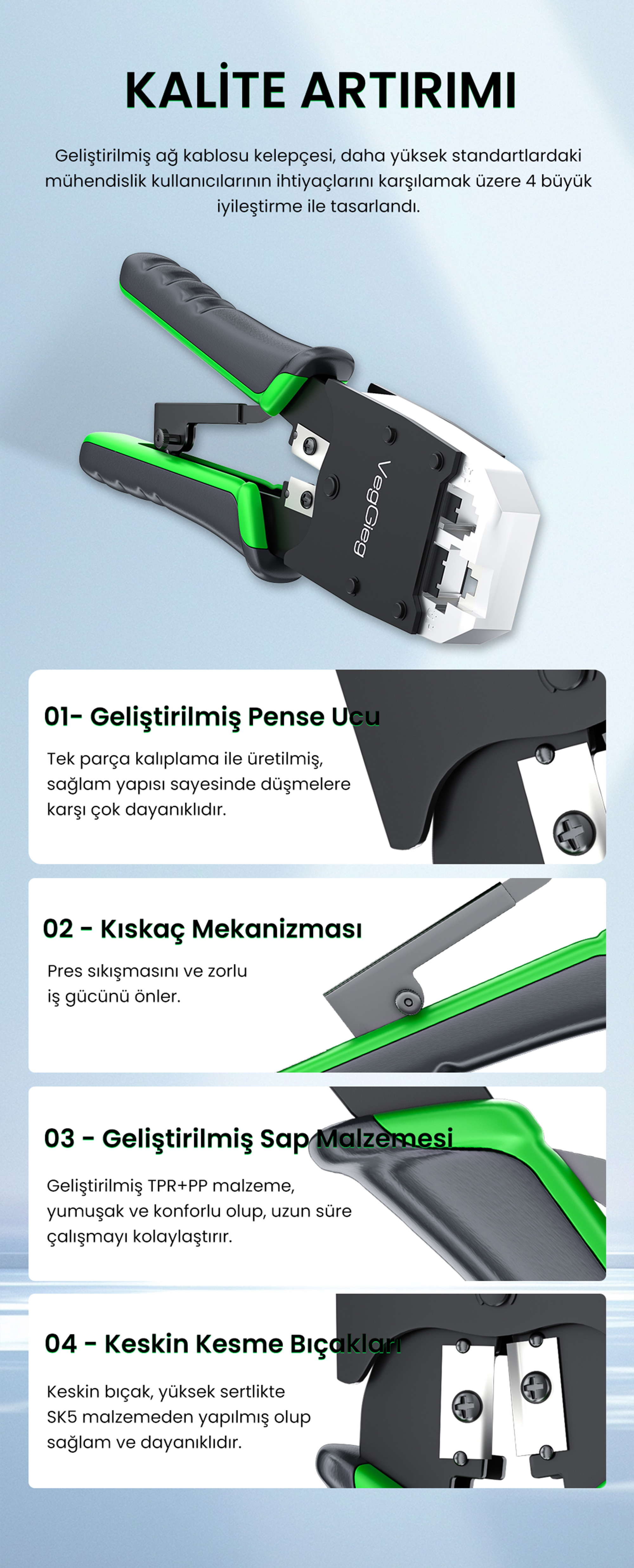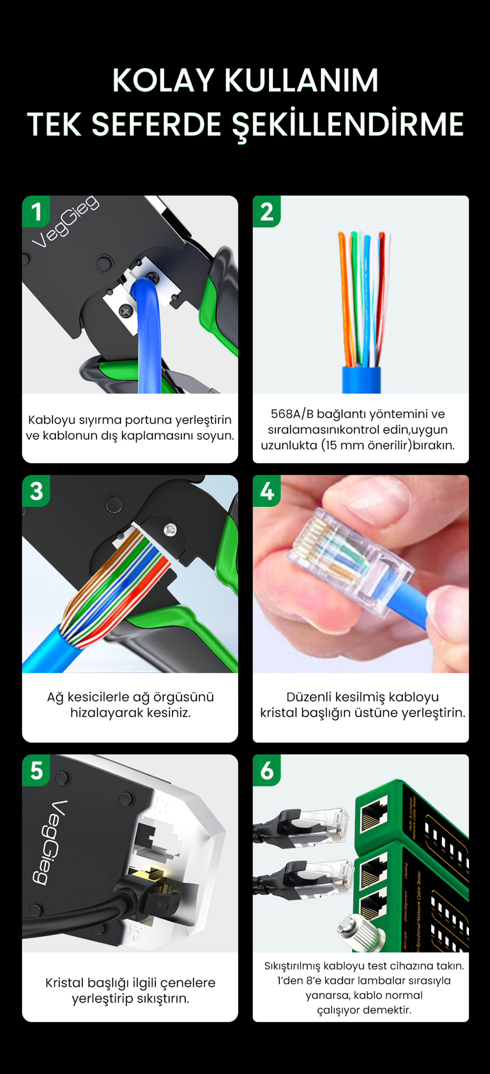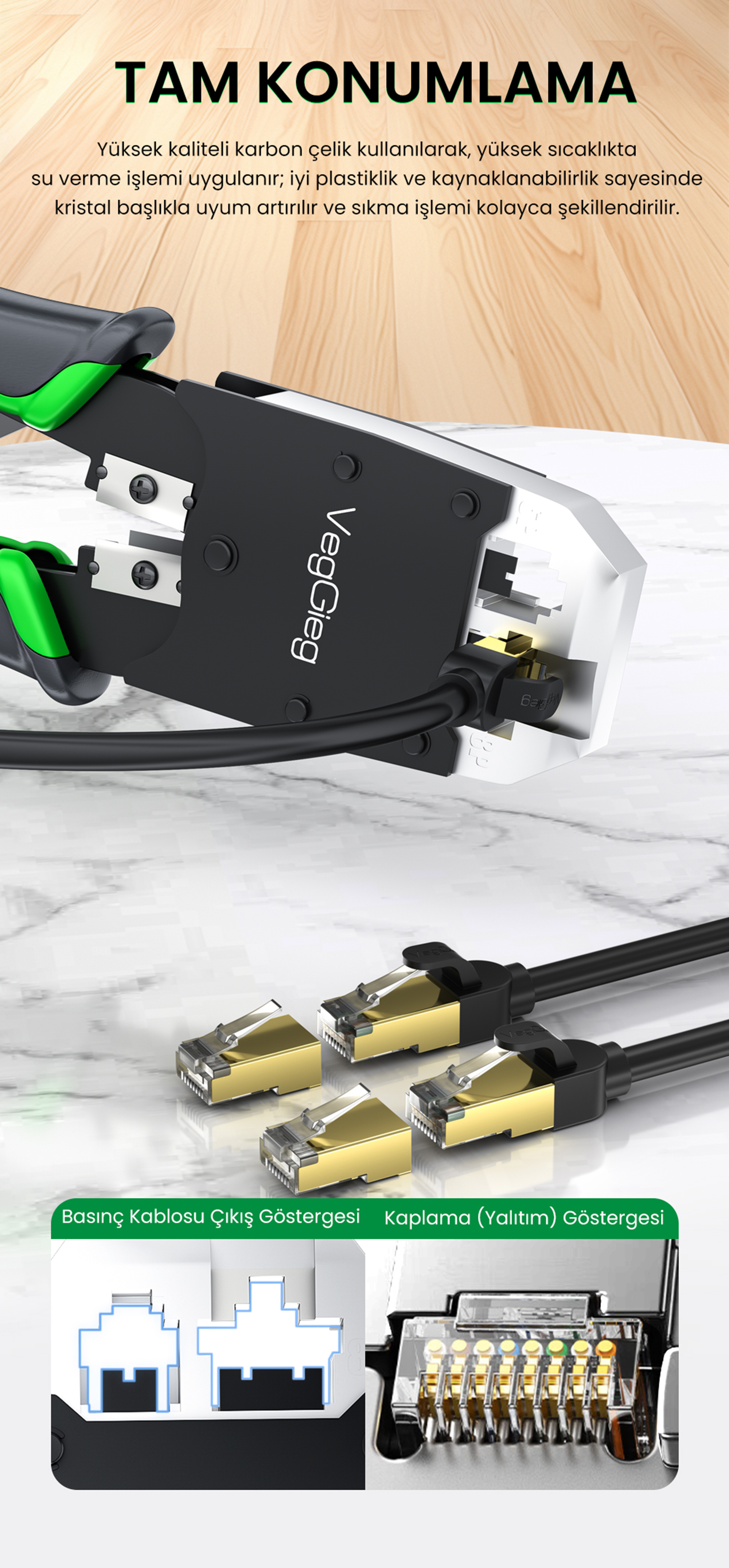 VegGieg Çok Fonksiyonlu RJ45 Sıkma Pensesi, ağ kablosu kurulum ve onarım işlerinizi tek aletle hızlı ve pratik şekilde halledebilirsiniz. VegGieg Çok Fonksiyonlu Network Pensesi, kablo kesme, soyma ve sıkma (jak çakma) işlemlerini bir arada sunarak hem zamandan hem emekten tasarruf sağlar.