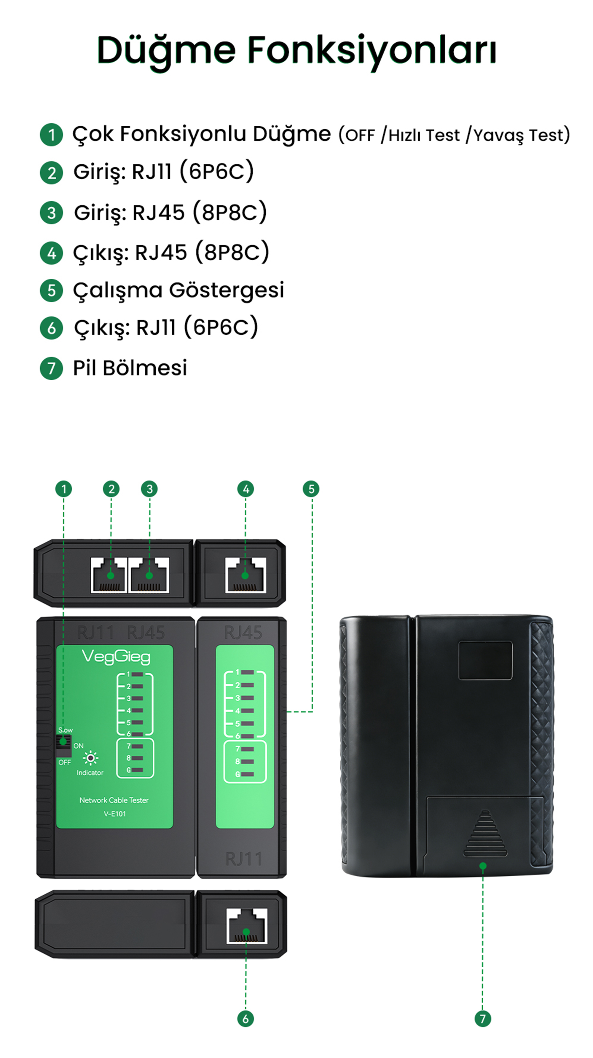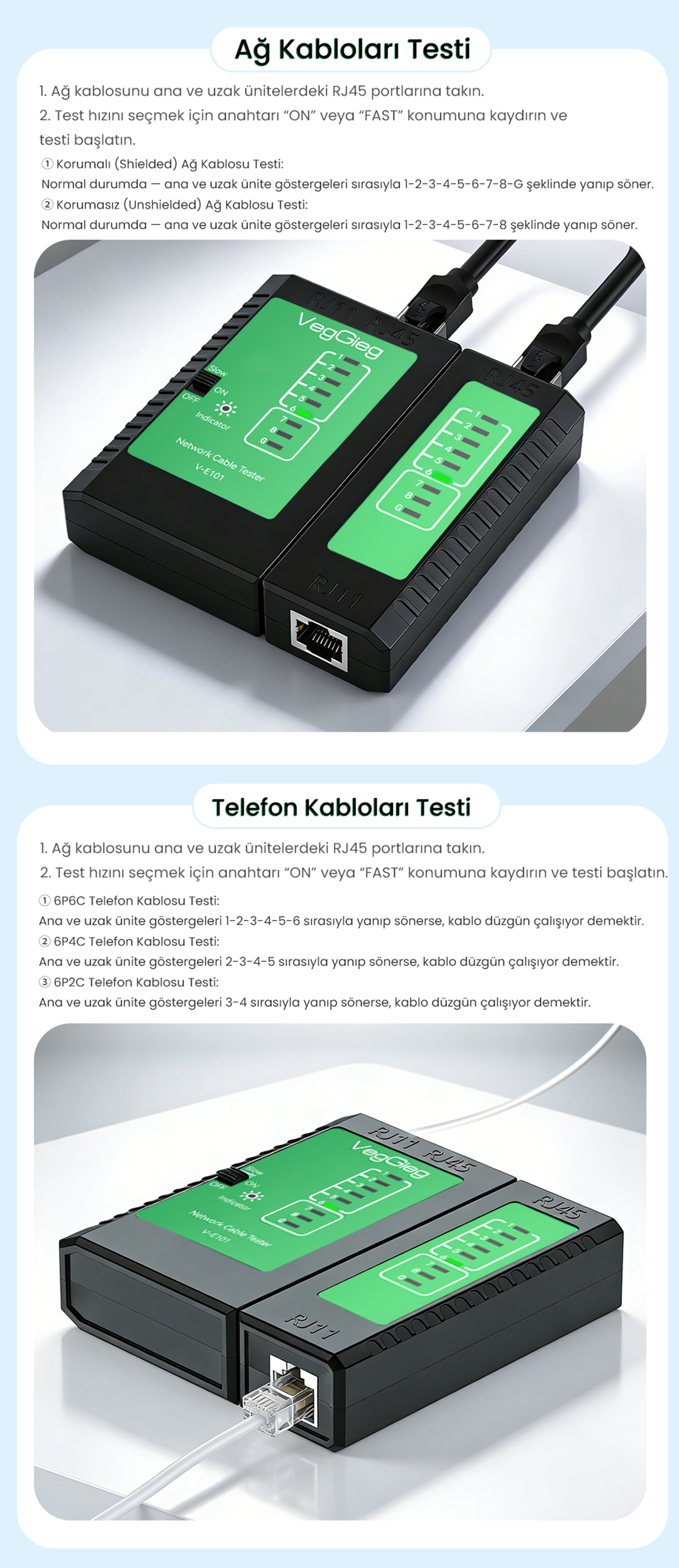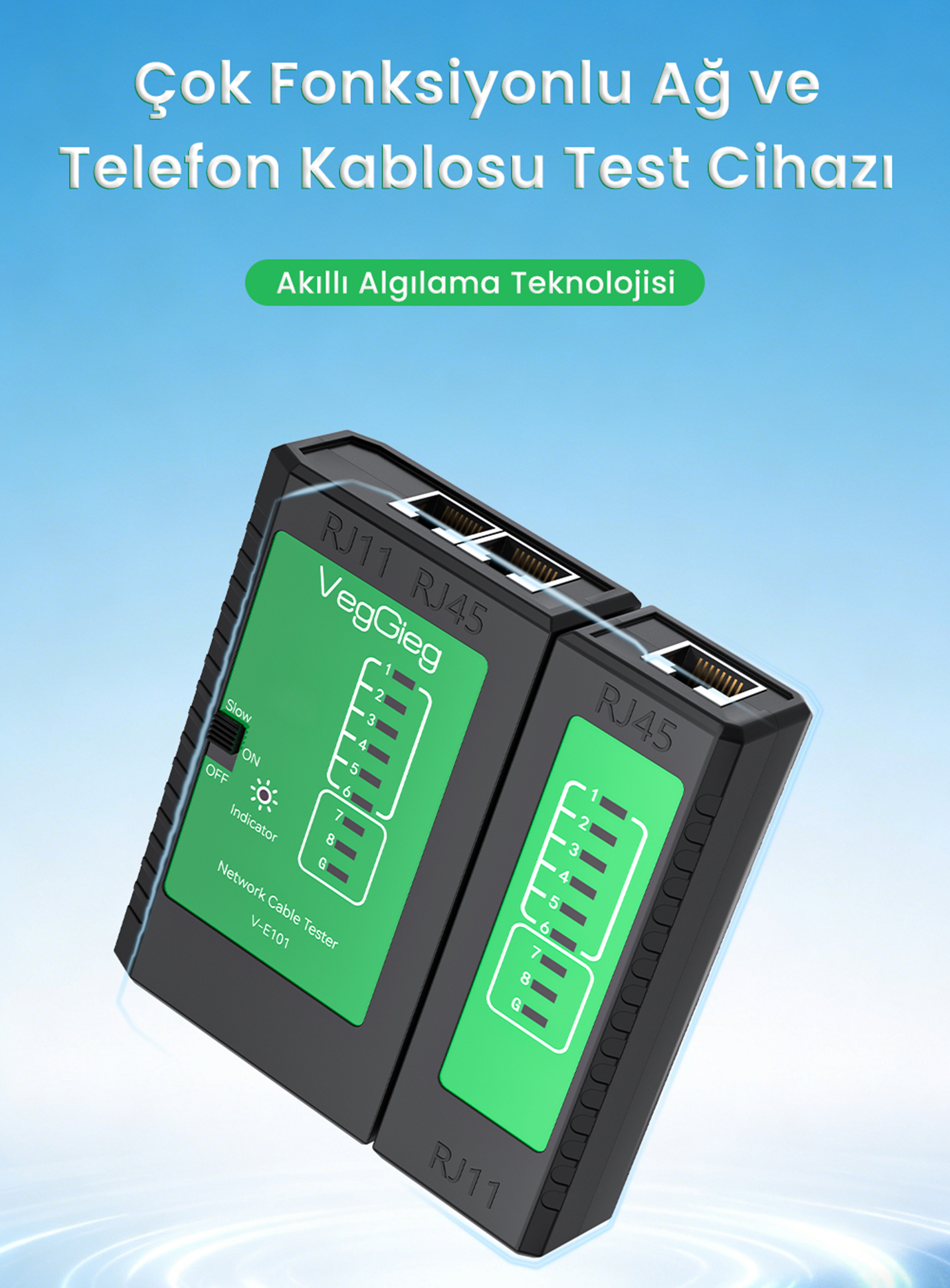 VegGieg V-E101 Çok Fonksiyonlu Ağ ve Telefon Kablosu Test Cihazı, ev ve ofis ağ kurulumlarında veya arıza tespit süreçlerinde en büyük yardımcınızdır. 2'si 1 arada (Two-in-one) çok fonksiyonlu yapısı sayesinde hem RJ45 ethernet ağ kablolarını hem de RJ11 telefon kablolarını tek bir cihaz üzerinden test etmenize olanak tanır. Akıllı algılama teknolojisi (Automatic detection) ile açık devre veya kısa devre gibi sorunları otomatik ve hızlı bir şekilde bularak ağ performansınızı güvence altına alır. Taşınabilir (Portable), güvenlik kontrollü (Safety check) ve tam donanımlı (Full-featured) yapısıyla profesyonel teknisyenlerden ev kullanıcılarına kadar herkes için ideal bir çözümdür.