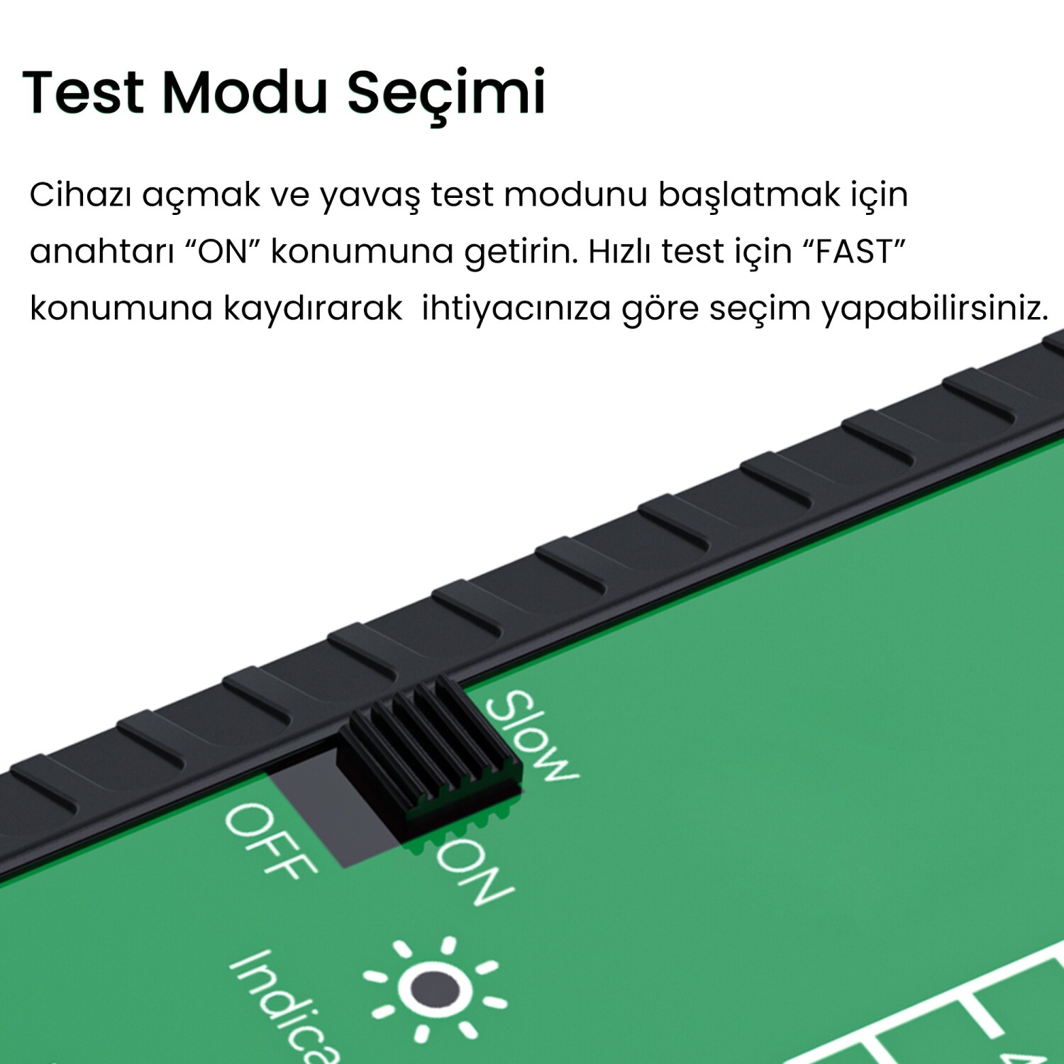 Cihaz üzerinde bulunan çok fonksiyonlu kademeli anahtar (OFF / ON / Slow) sayesinde test modunu ihtiyacınıza göre ayarlayabilirsiniz. Hızlı test için anahtarı "ON" (veya FAST) konumuna getirebilir, testi daha dikkatli takip etmek isterseniz "Slow" (Yavaş) modunu seçerek LED ışıkların daha yavaş yanmasını sağlayabilirsiniz.