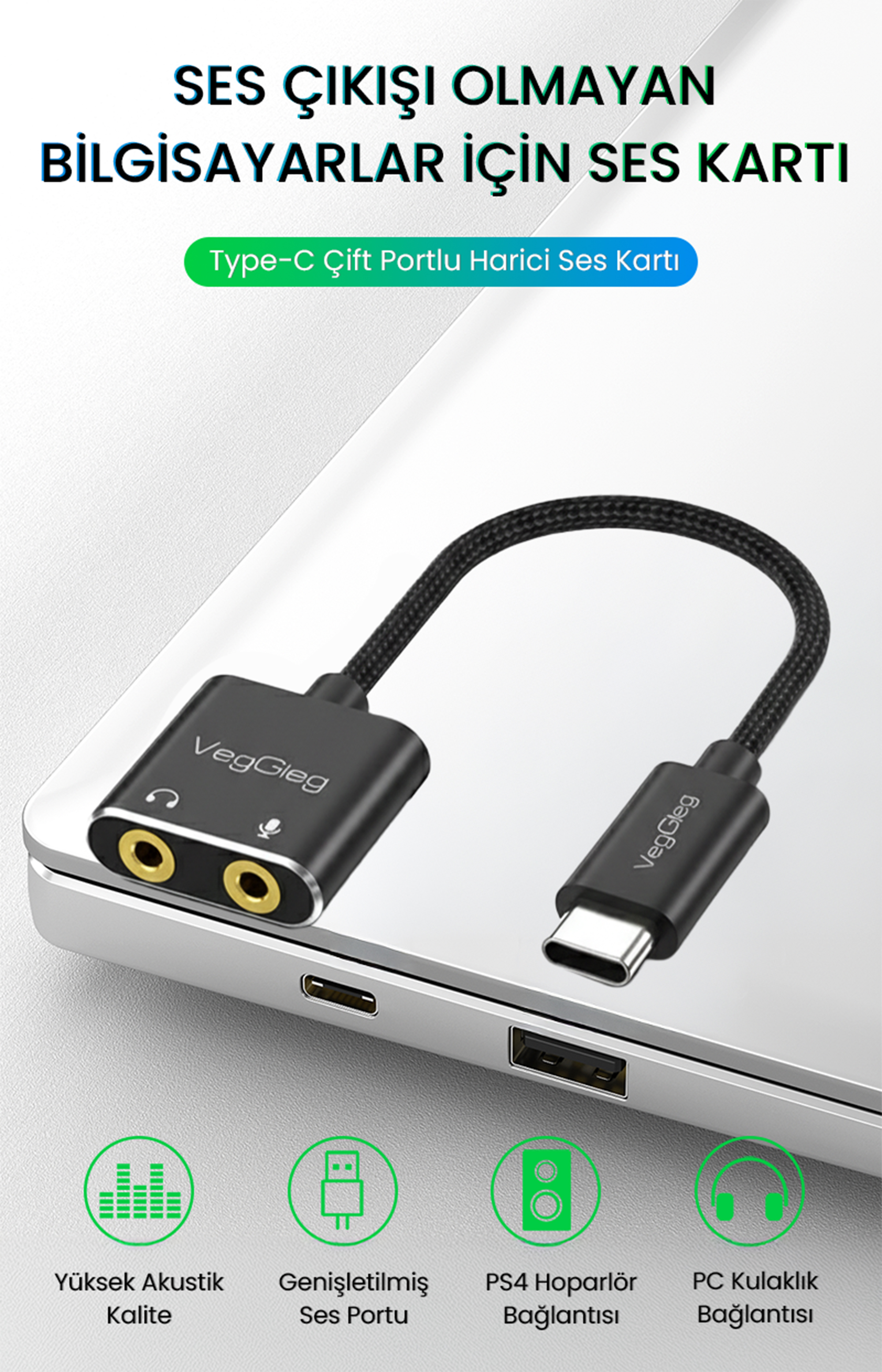 1 x VegGieg Type-C Ses Kartı 3.5mm Kulaklık ve Mikrofon Girişli