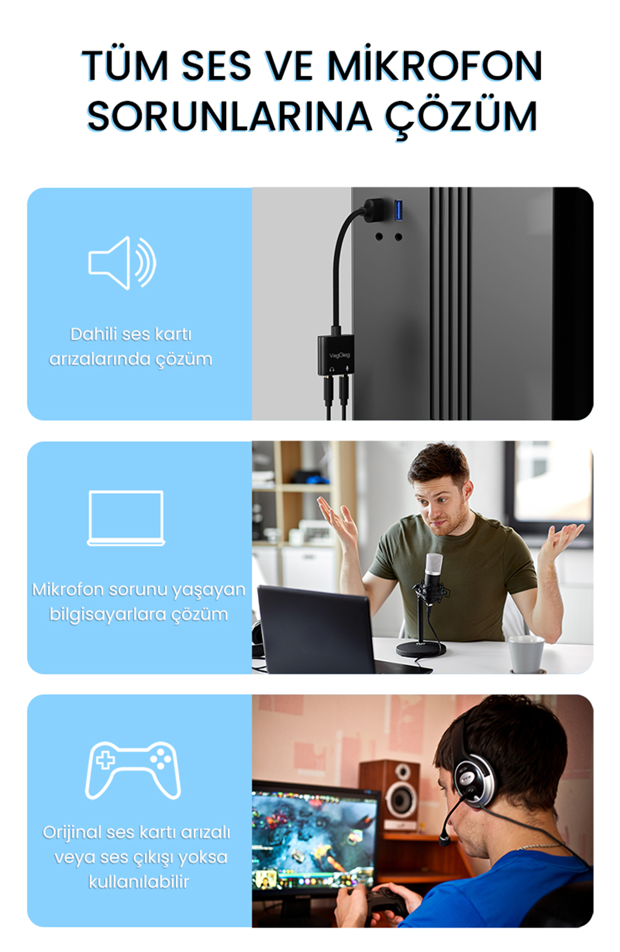 Anakartı üzerindeki ses yongası veya 3.5mm jak girişleri fiziksel olarak bozulmuş bilgisayarlara anında ve masrafsız ses kartı entegrasyonu.