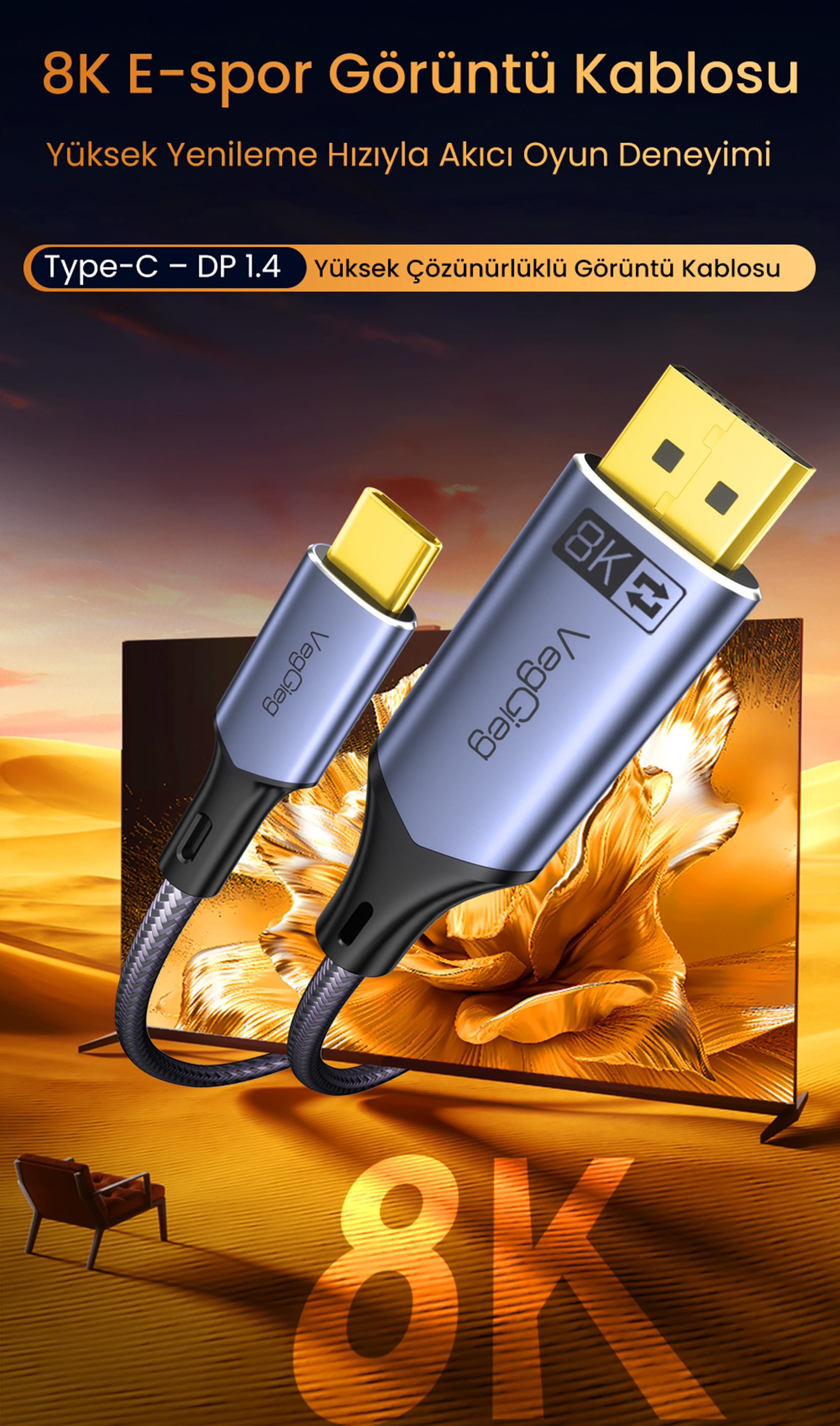 VegGieg USB-C to DP 8K Çift Yönlü Sinyal Dönüştürücü Kablo, USB-C ve DisplayPort arayüzleri arasında yüksek çözünürlüklü ses ve görüntü aktarımı sağlamak için tasarlanmıştır. Çift yönlü (bi-directional) veri iletim desteği sayesinde hem USB-C’den DisplayPort’a hem de DisplayPort’tan USB-C’ye dönüşüm imkânı sunar. 48Gbps yüksek bant genişliği, HDR desteği ve 8K çözünürlük desteği ile gelişmiş görüntü aktarım ihtiyaçlarına yönelik bir bağlantı çözümü sunar.