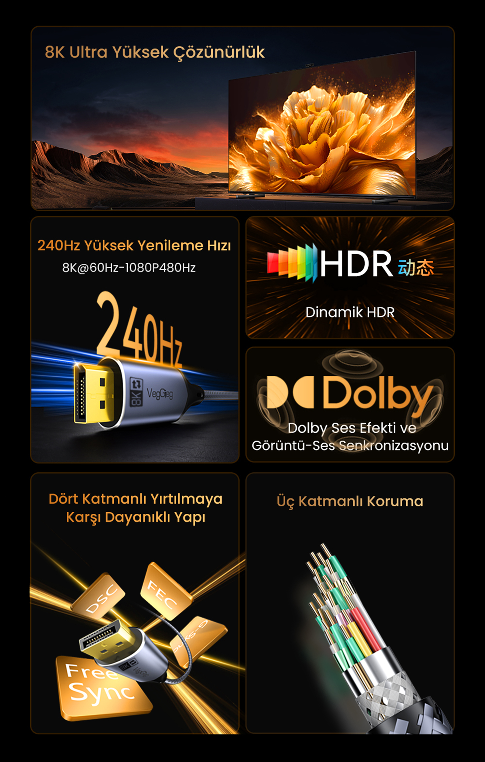 Çözünürlük Desteği: 8K@60Hz, 4K@240Hz