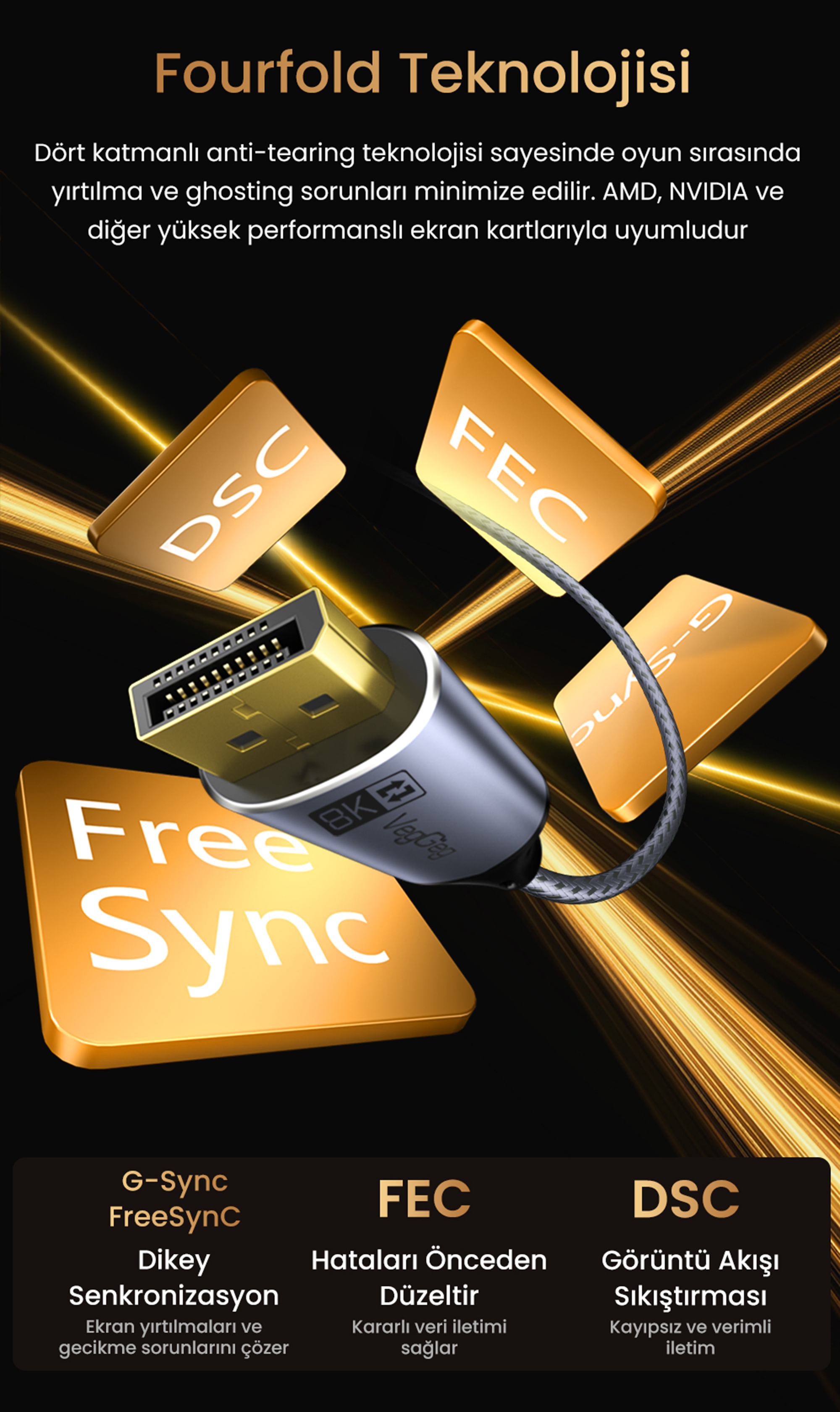 8K@60Hz ve 4K@240Hz çözünürlük desteği sunar. Ayrıca 4K@60Hz ve 240Hz yenileme hızlarını destekleyerek yüksek akıcılık gerektiren görüntüleme senaryolarında avantaj sağlar. Yüksek çözünürlük ve yüksek yenileme hızı desteği sayesinde detaylı ve akıcı görüntü deneyimi elde edilmesine yardımcı olur.
