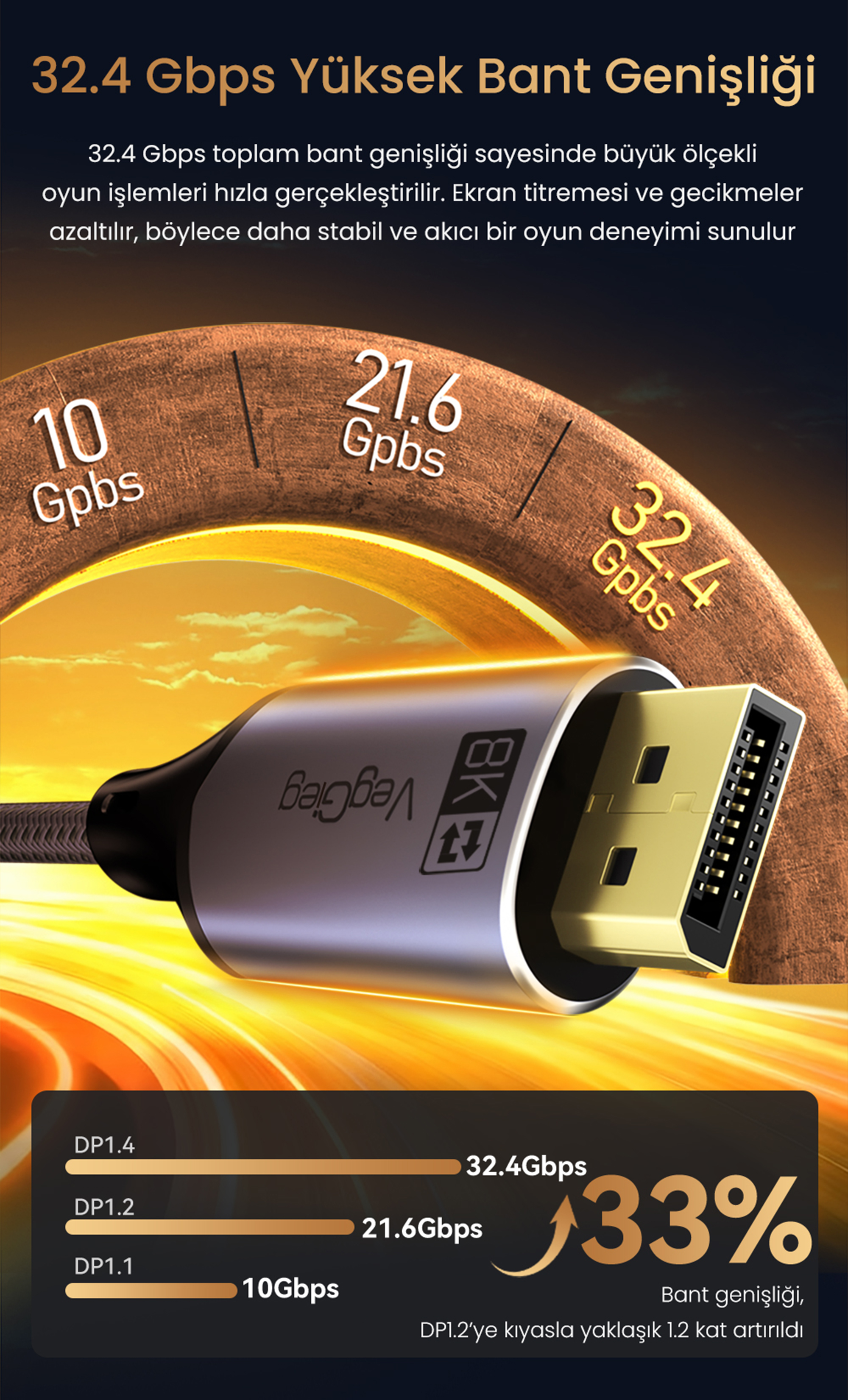 48Gbps yüksek hızlı veri iletim kapasitesine sahip olan kablo, yüksek çözünürlüklü görüntü ve ses sinyallerinin stabil şekilde aktarılmasını hedefler. Yüksek bant genişliği sayesinde görüntüde gecikme ve senkron kaybını minimum seviyede tutmaya yardımcı olur. Profesyonel ve günlük kullanım senaryoları için uygundur.