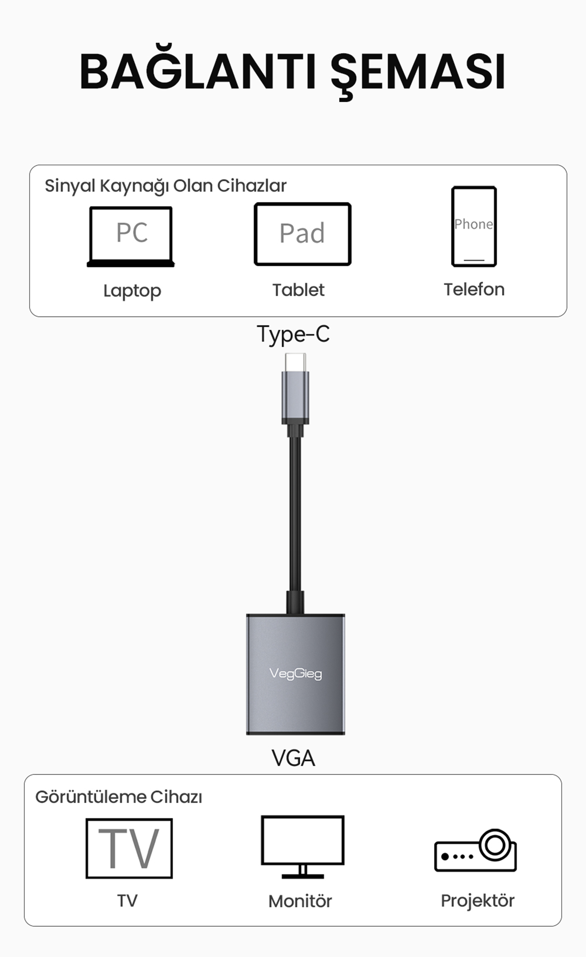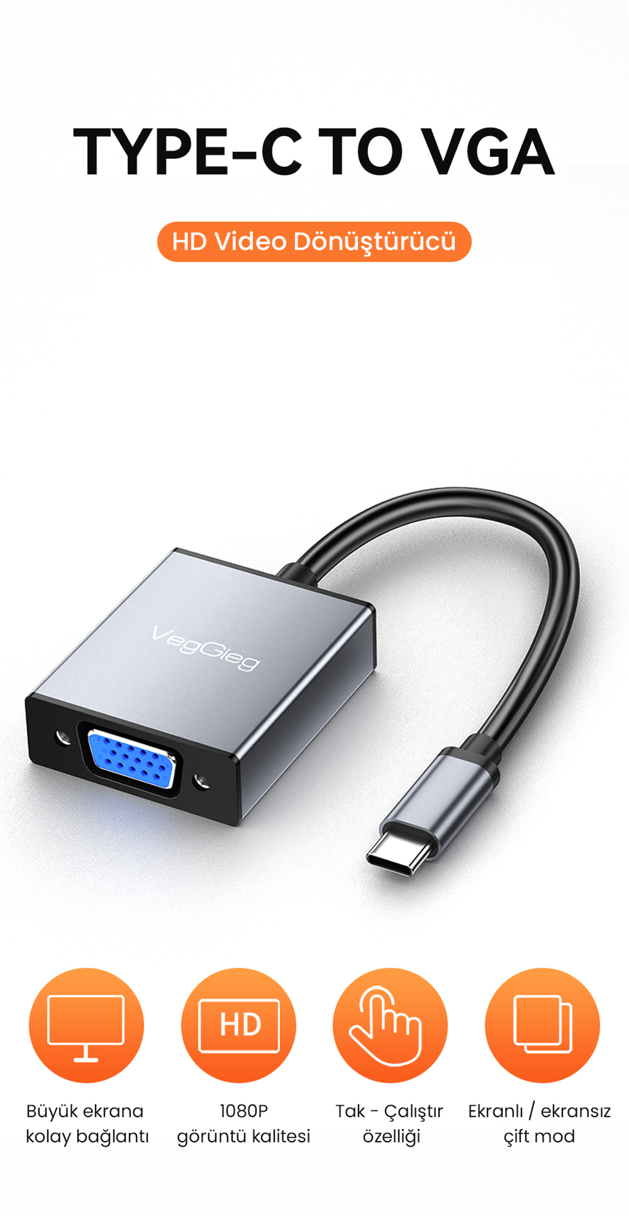 VegGieg Type-C to VGA 1080P 60Hz Çevirici Dönüştürücü Kablo Adaptör, USB Type-C çıkışına sahip dizüstü bilgisayar, akıllı telefon veya tabletlerinizi VGA girişli monitör, televizyon veya projektörlere kolayca bağlamanızı sağlayan kompakt ve kullanışlı bir dönüştürücü kablodur. Görsel içeriklerinizi daha büyük ekranlara aktarmak isteyen kullanıcılar için ideal bir çözüm sunar. Sunumlardan film izlemeye, oyunlardan uzaktan eğitime kadar geniş bir kullanım alanına sahiptir.