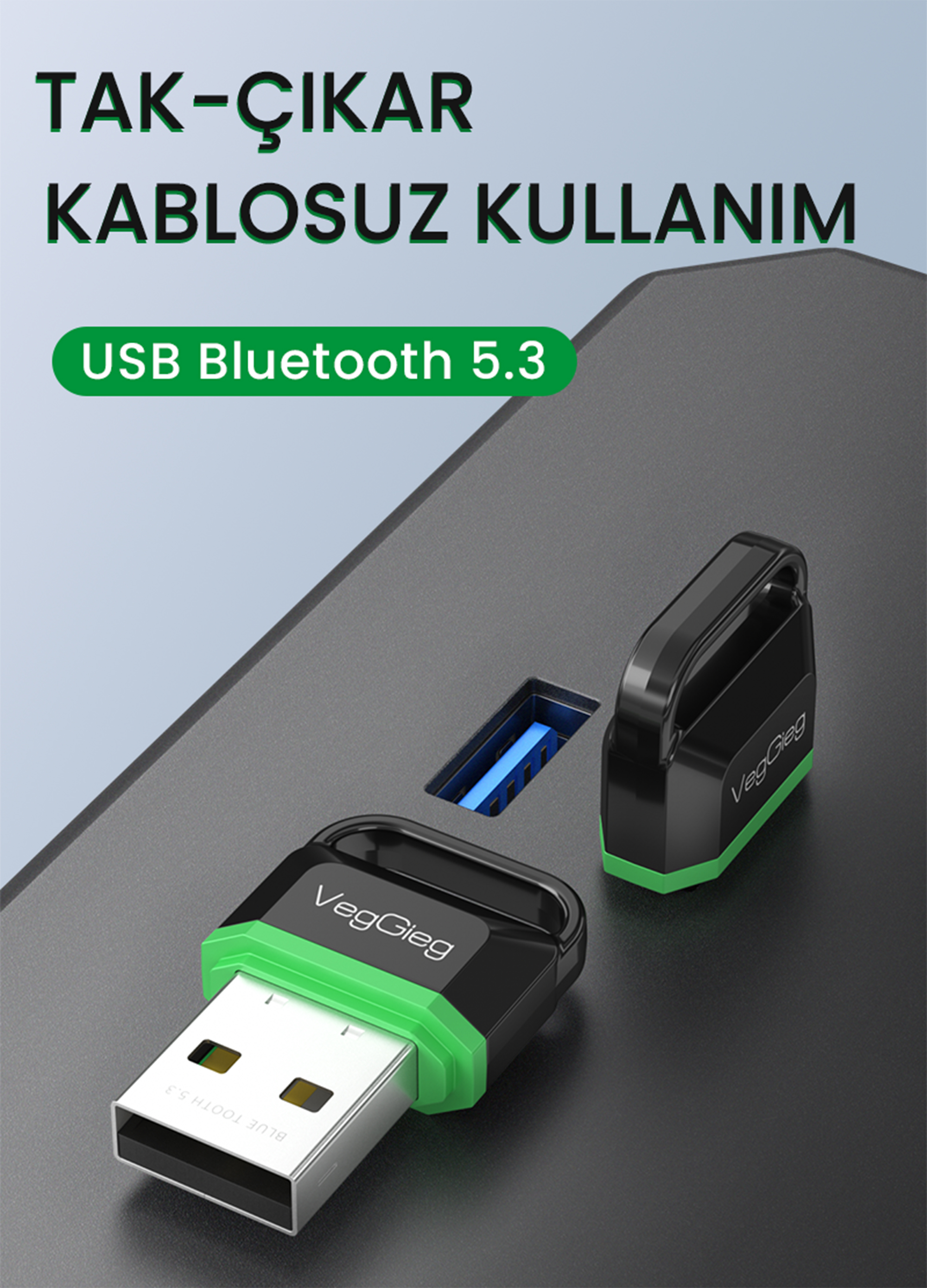 VegGieg Bluetooth 5.3 Mini USB Dongle ile kablosuz bağlantı deneyiminizi bir üst seviyeye taşıyabilirsiniz. Tak-çalıştır özelliği sayesinde hızlı ve kolay bir şekilde bilgisayarınıza bağlanan bu mini adaptör, yüksek kaliteli ses ve veri aktarımı ile klavye, mouse, kulaklık, hoparlör ve gamepad gibi cihazlarınızı gecikmesiz kullanmanıza olanak tanır.