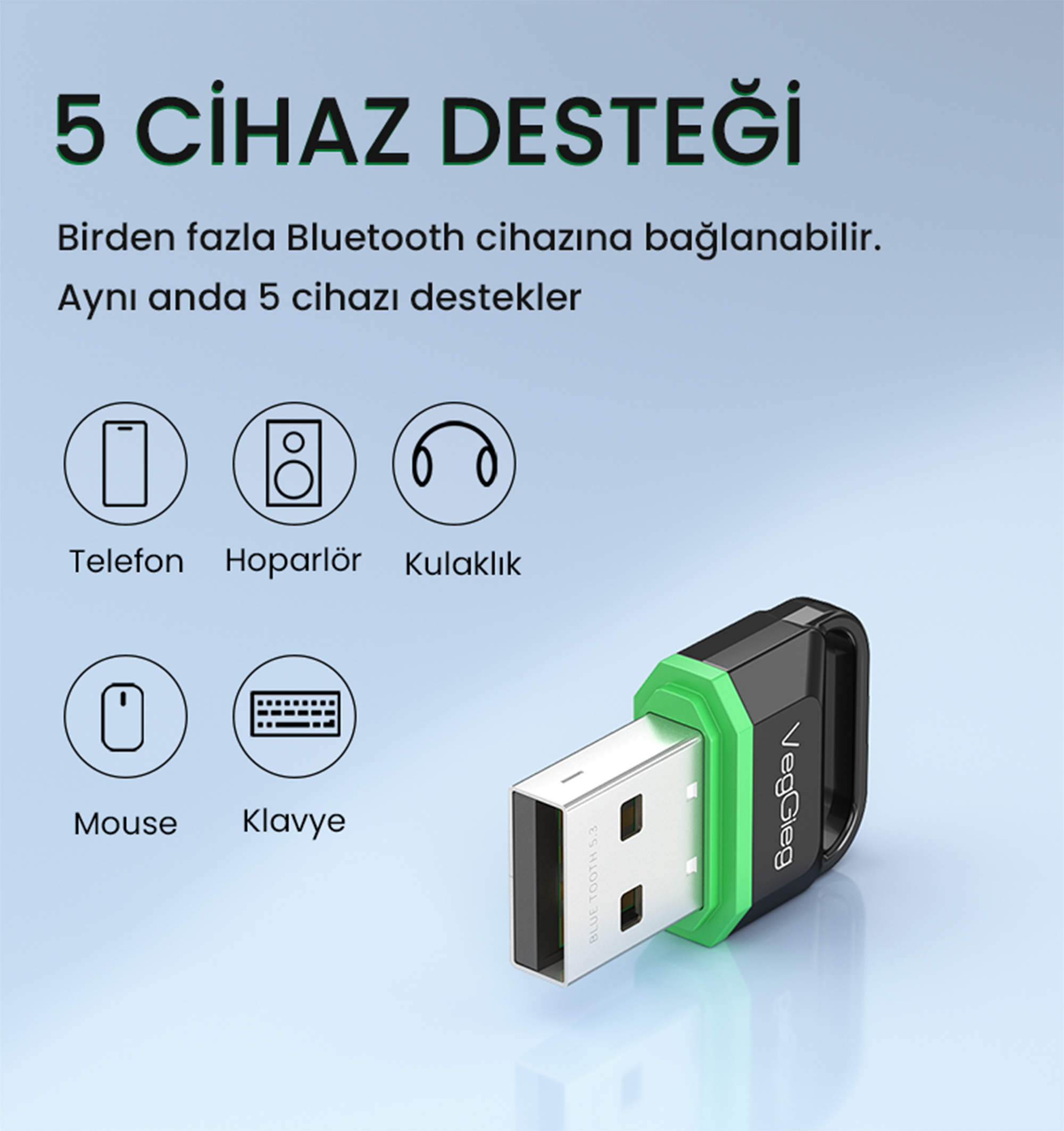 Fazla engel olmayan ortamlarda 20 metreye kadar bağlantı sağlayan VegGieg Mini USB Dongle, tak çalıştır özelliği sayesinde sürücü yüklemenize gerek kalmadan hemen kullanıma hazırdır. Windows işletim sistemi ile uyumlu çalışarak cihazlar arası bağlantıyı basitleştirir.
