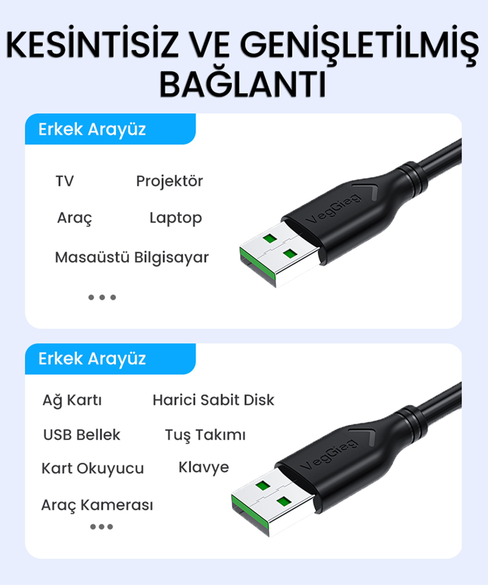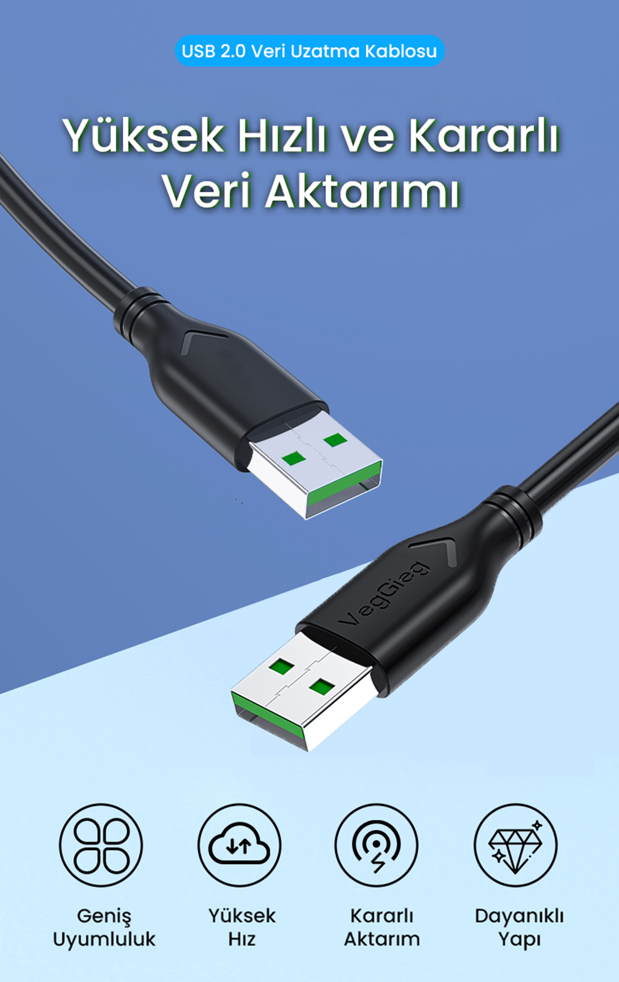 VegGieg USB 2.0 kablo, 480Mbps’e kadar veri aktarım hızıyla dosyalarınızı kısa sürede güvenli bir şekilde aktarır. Film, müzik, belge ve yedekleme işlemlerinde yüksek performans sunar.