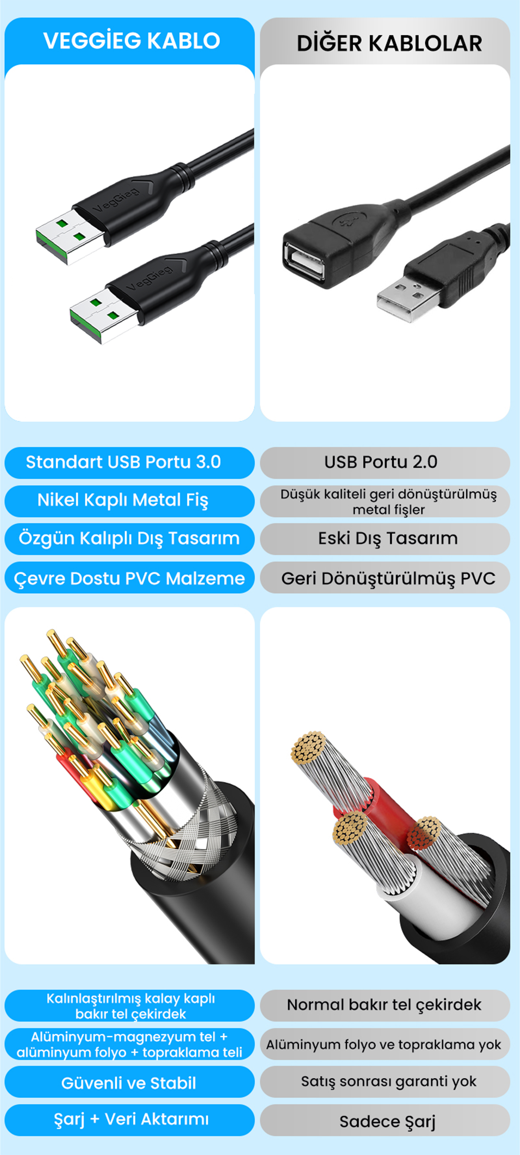 VegGieg USB 2.0 Data ve Şarj Kablosu, yüksek kaliteli malzeme yapısı ve hızlı veri iletim desteği ile öne çıkar. Bilgisayarınıza ya da taşınabilir cihazlarınıza veri aktarımı ve şarj işlemini güvenli şekilde yapmanızı sağlar. Oksijensiz saf bakır iç telleri sayesinde kesintisiz veri transferi sunarken, PVC dış kaplaması ile uzun ömürlü kullanım sağlar. Hard disk kutusu, notebook soğutucu, fan ve benzeri USB destekli cihazlar için ideal bir bağlantı kablosudur.
