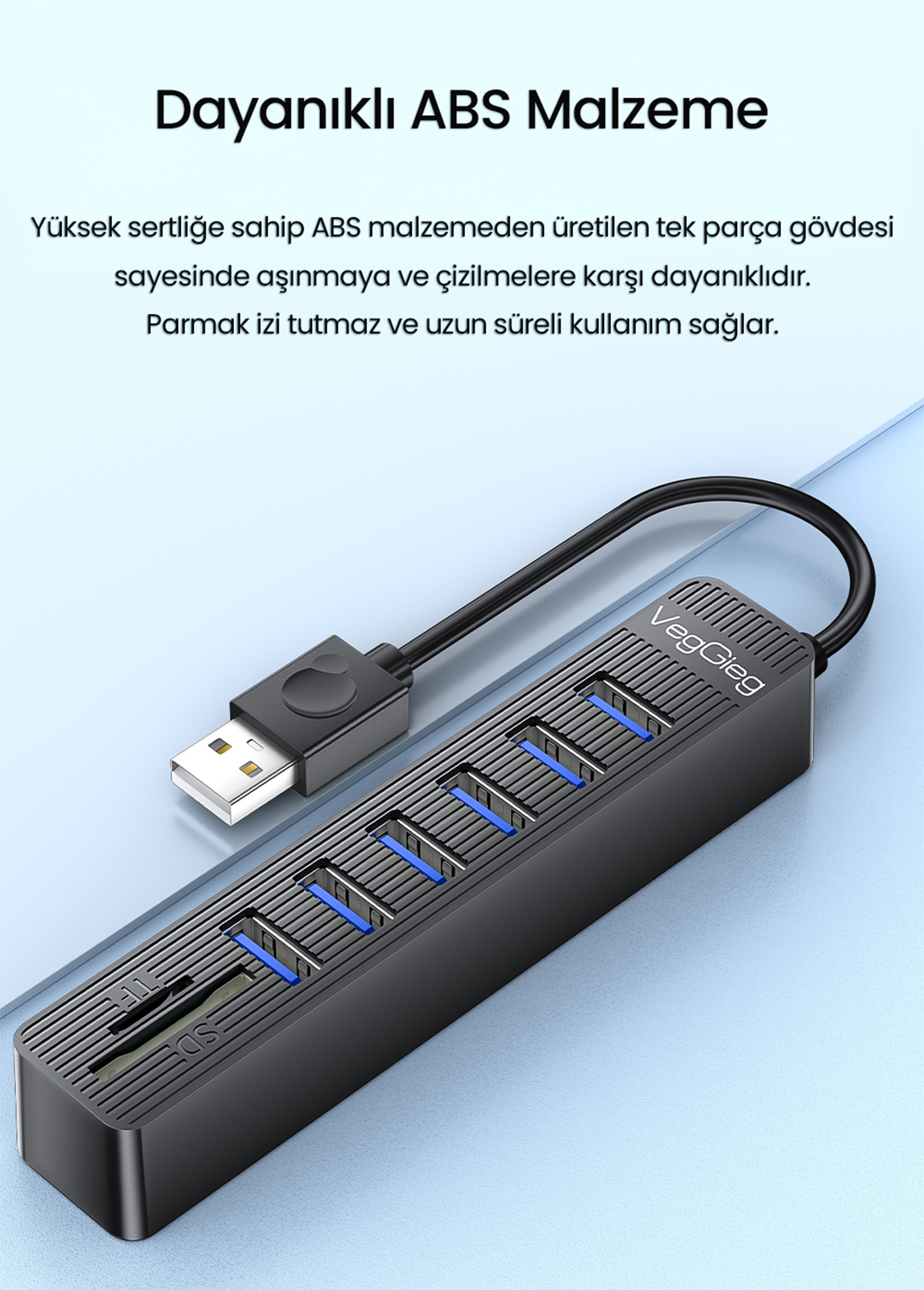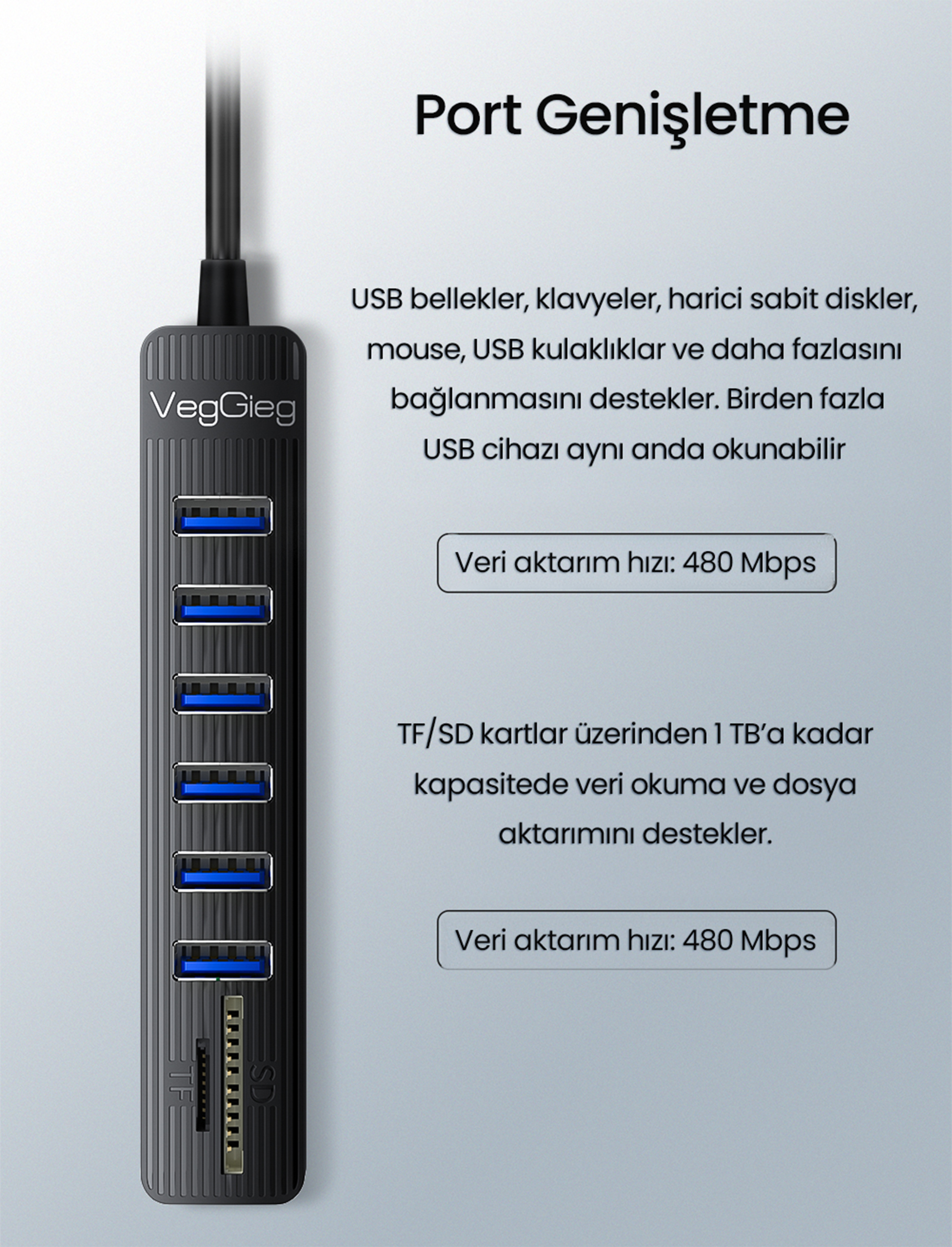 VegGieg V-C306 Çok Fonksiyonlu Hub, 6 adet USB 2.0 portu ve entegre SD/TF (Micro SD) kart okuyucu yuvalarıyla donatılan bu çoklayıcı, klavyeden yazıcıya, fareden hafıza kartlarına kadar tüm çevre birimlerinizi aynı anda bilgisayarınıza bağlamanızı sağlar. Özellikle masaüstü bilgisayar kullanıcıları için büyük bir özgürlük sunan 1 metrelik ekstra uzun kablosu sayesinde, kasanın arkasına eğilme derdine son vererek tüm bağlantıları elinizin altına, masanızın üstüne taşır.
