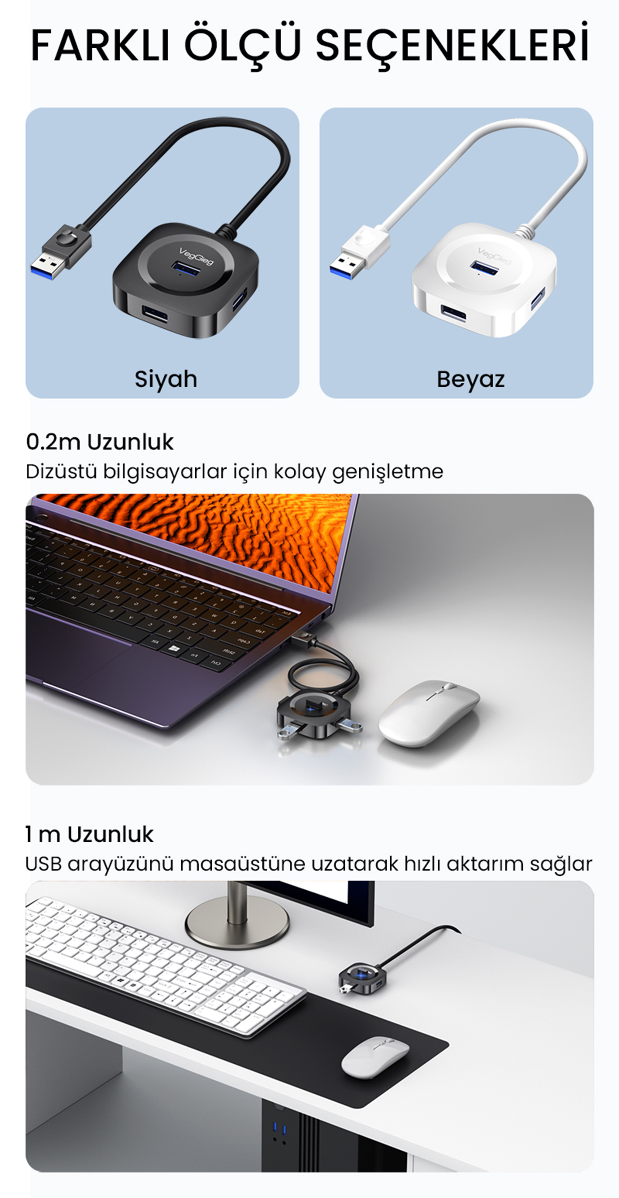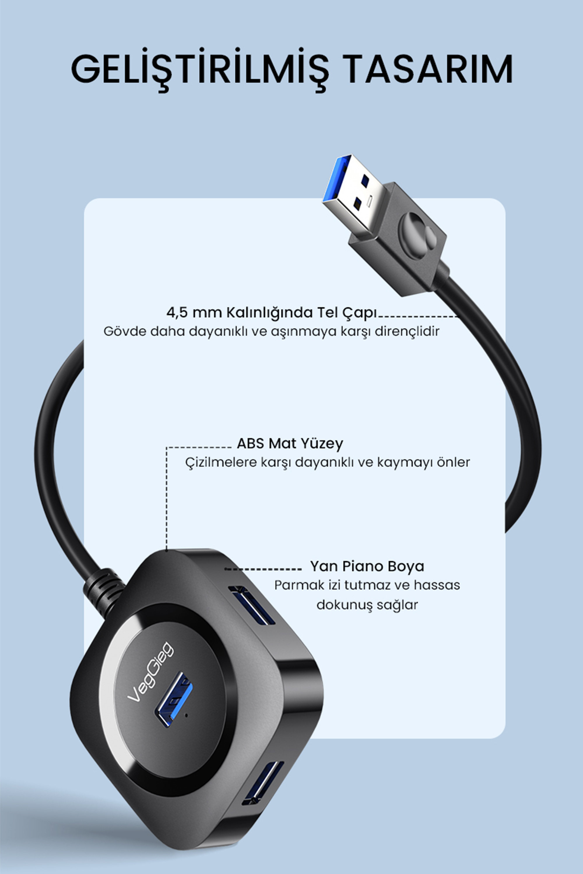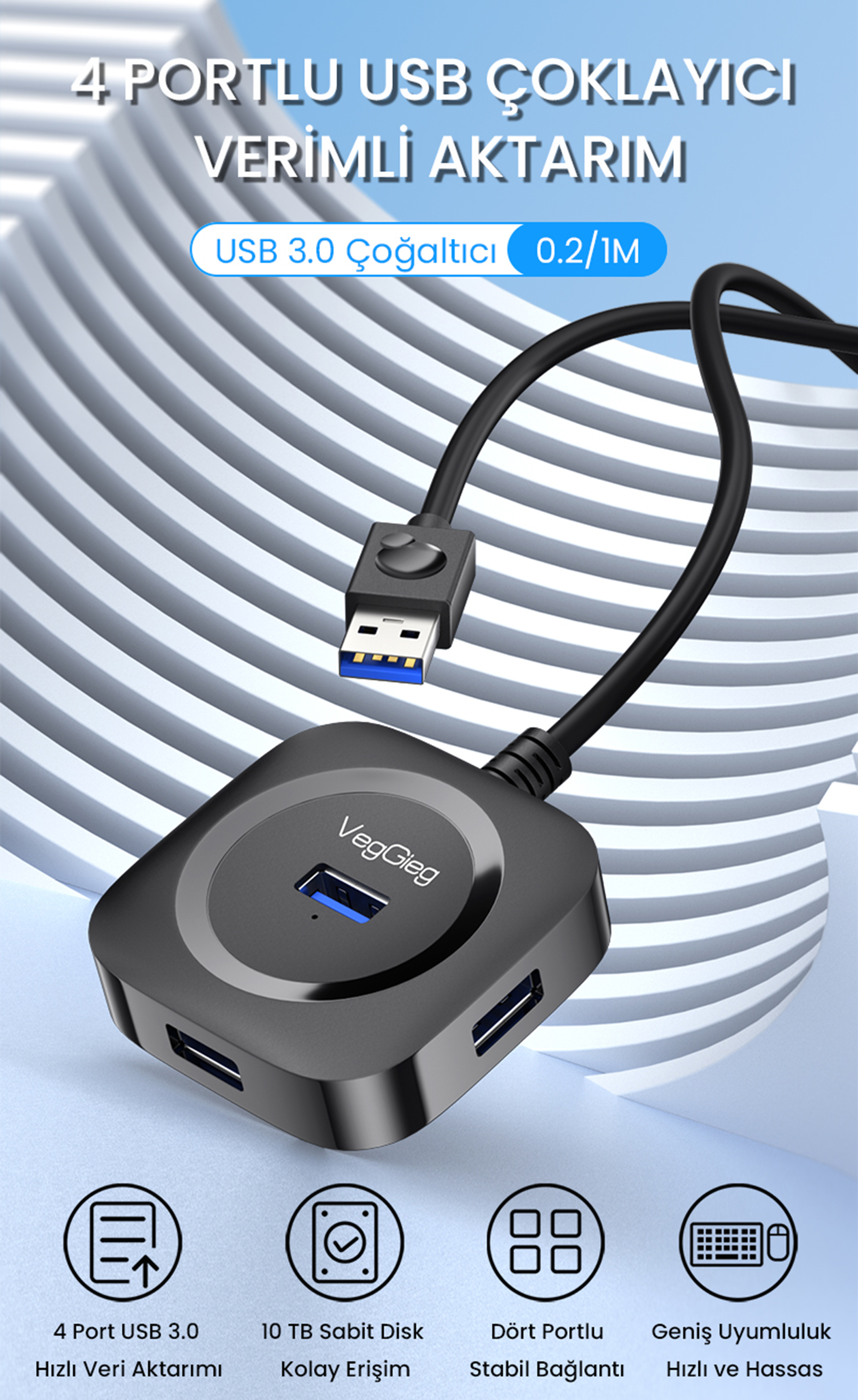 VegGieg USB 3.0 4 Portlu Çoklayıcı Hub, bilgisayarınıza ek USB bağlantı noktaları kazandırmak için ideal bir çözümdür. Modern tasarımı, yüksek veri aktarım hızı ve geniş uyumluluk özellikleriyle, günlük ofis ve ev kullanımında pratiklik sunar. 5Gbps hızında aktarım desteği sayesinde dosya transferlerinizi hızlıca tamamlayabilir, aynı anda birden fazla cihazı sorunsuz şekilde kullanabilirsiniz.