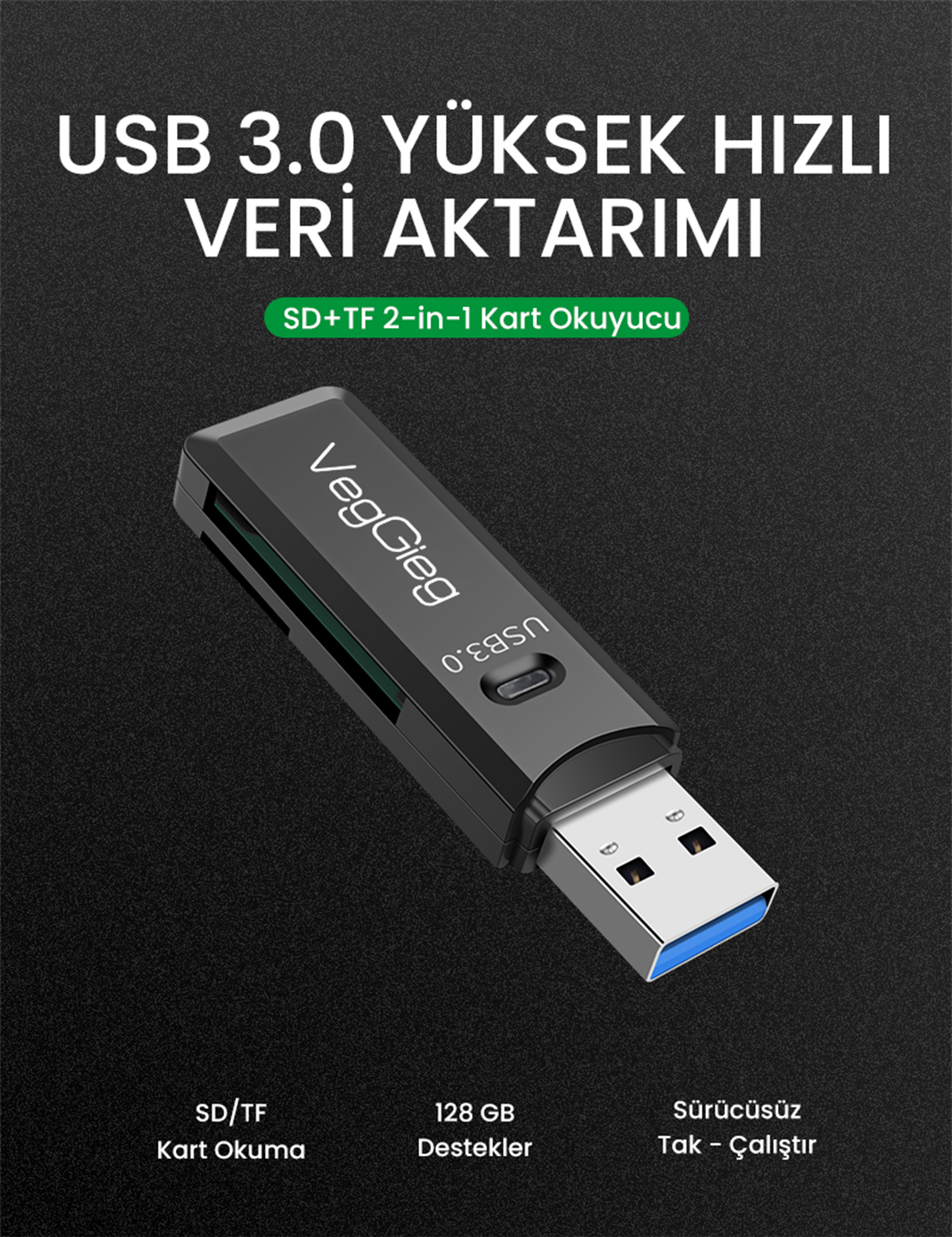 VegGieg USB 3.0 SD ve Micro SD Hafıza Kart Okuyucu, fotoğraf, video ve belge aktarım süreçlerinizi hızlandırmak için tasarlanmış, USB 3.0 destekli pratik bir kart okuyucudur. Hem SD hem de Micro SD (TF) kartları aynı anda okuma ve yazma özelliği ile farklı kart türleri arasında geçiş yapmanıza gerek kalmaz. 128 GB'a kadar kart desteği ve saniyede 95MB’a kadar aktarım hızıyla, büyük dosyaları bile sadece birkaç saniyede aktarabilirsiniz.