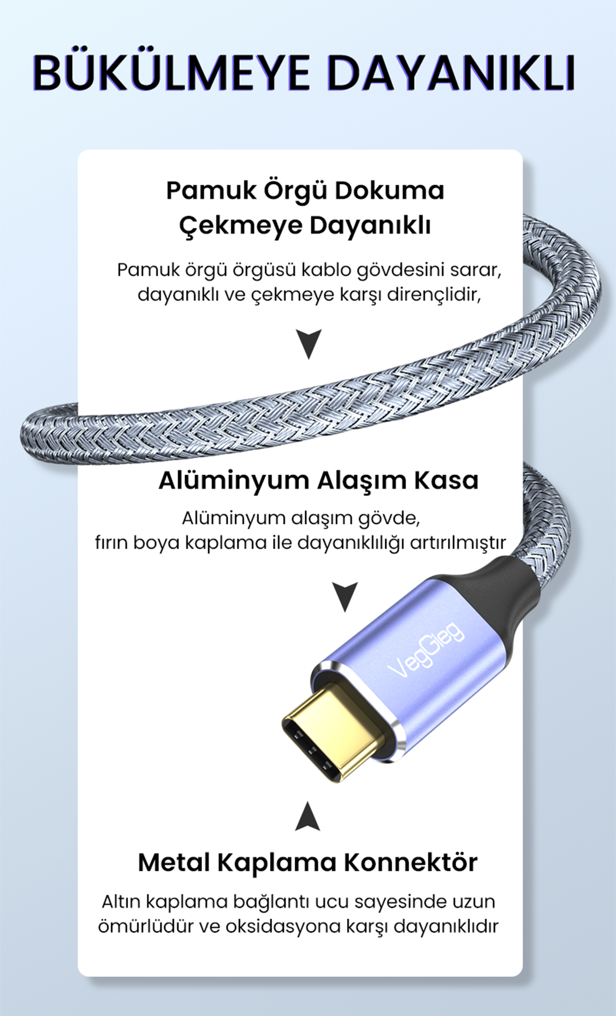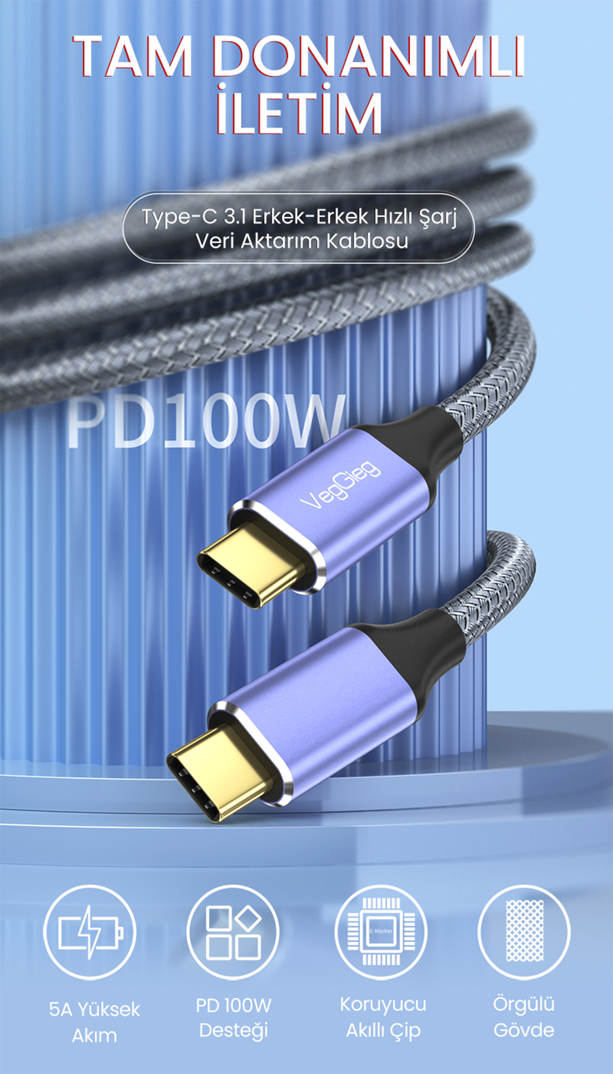 VegGieg USB 3.1 Type-C PD 100W 5A 10Gbps 4K 60Hz Destekli Kablo, Type-C bağlantı noktasına sahip cihazlar arasında yüksek hızlı veri, görüntü ve güç aktarımı sağlamak üzere tasarlanmış çok yönlü bir kablodur. 10Gbps veri aktarım hızı, 100W'a kadar hızlı şarj desteği ve 4K / 60Hz video çıkışı ile hem günlük kullanım hem de profesyonel ihtiyaçlar için ideal bir çözümdür. Örgülü yapısı sayesinde uzun ömürlü ve dayanıklıdır, aşınma ve kırılmalara karşı üstün koruma sağlar.