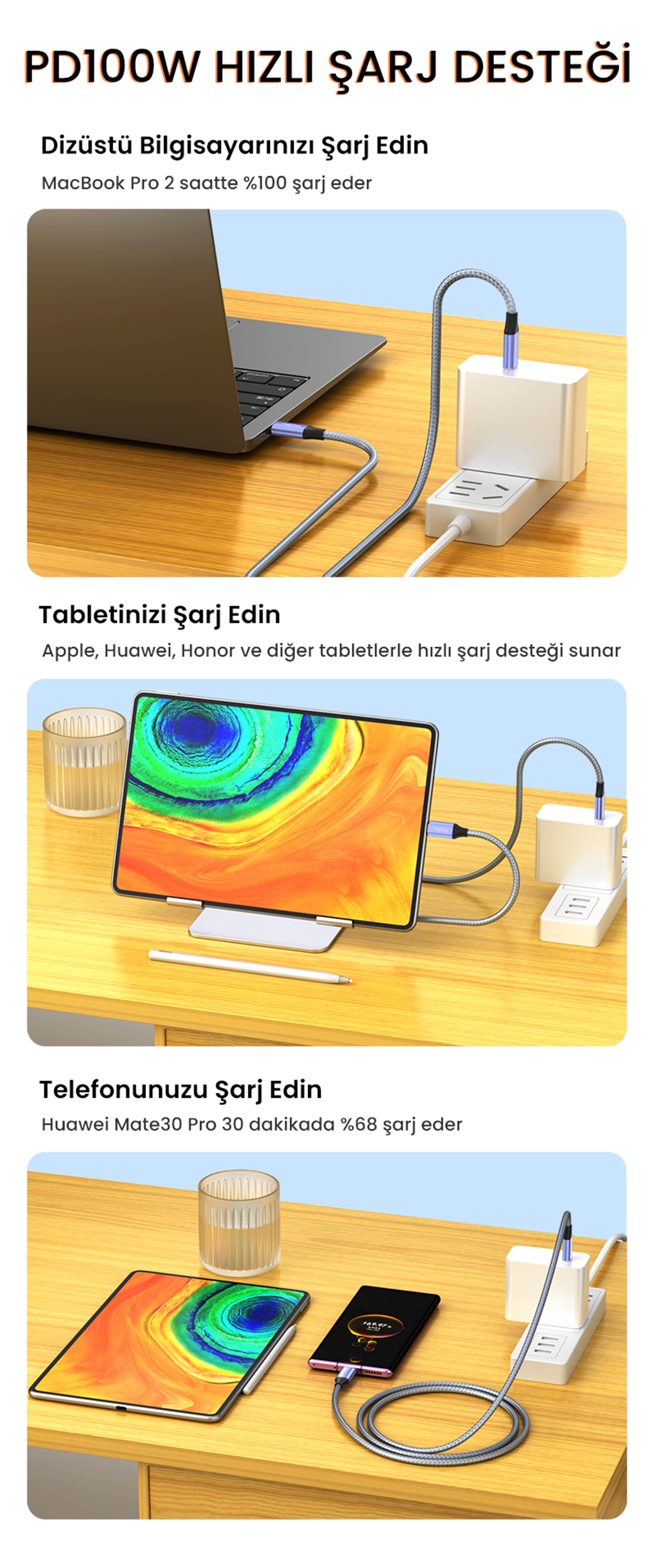 USB Power Delivery (PD) 3.1 standardını destekleyen bu kablo, 100W'a kadar güç aktarımı sağlar. 20V/5A destekli şarj özelliği sayesinde dizüstü bilgisayarlar, tabletler ve hızlı şarj destekli telefonları güvenli şekilde şarj etmenizi mümkün kılar.