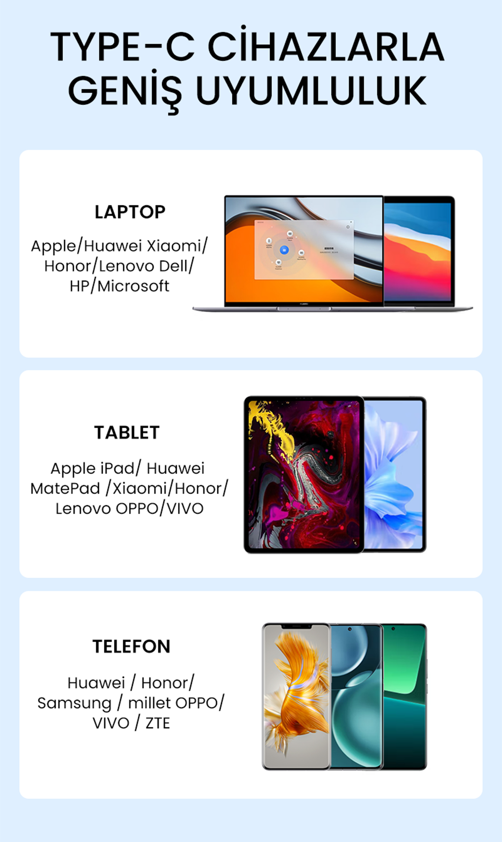 Type-C bağlantı noktasına sahip MacBook, Huawei, Samsung, Xiaomi, Dell, Lenovo gibi dizüstü bilgisayarlar, tabletler, akıllı telefonlar ve Nintendo Switch gibi birçok cihazla uyumludur.