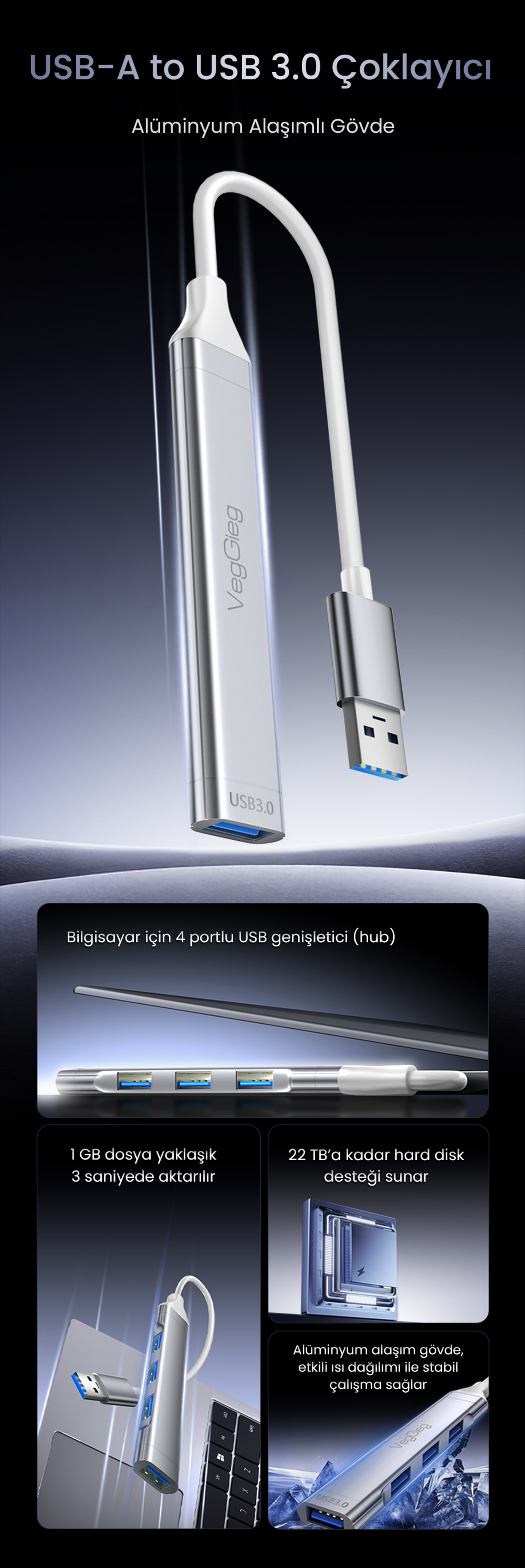 Masaüstü veya dizüstü bilgisayarınızdaki port eksikliğini VegGieg 4 Portlu USB Hub ile şık, güvenli ve verimli bir şekilde ortadan kaldırın! Zarif alüminyum alaşımlı tasarımı ve pratik kullanımıyla çalışma masanıza mükemmel uyum sağlayan bu çoklayıcı, bilgisayarınızdaki tek bir standart USB (USB-A) portunu dört adet işlevsel USB bağlantı noktasına dönüştürür. Tak-çalıştır özelliği sayesinde hiçbir sürücü kurulumuna gerek duymadan klavye, mouse, yazıcı ve bellek gibi cihazlarınızı saniyeler içinde bağlamanın rahatlığını yaşayın.